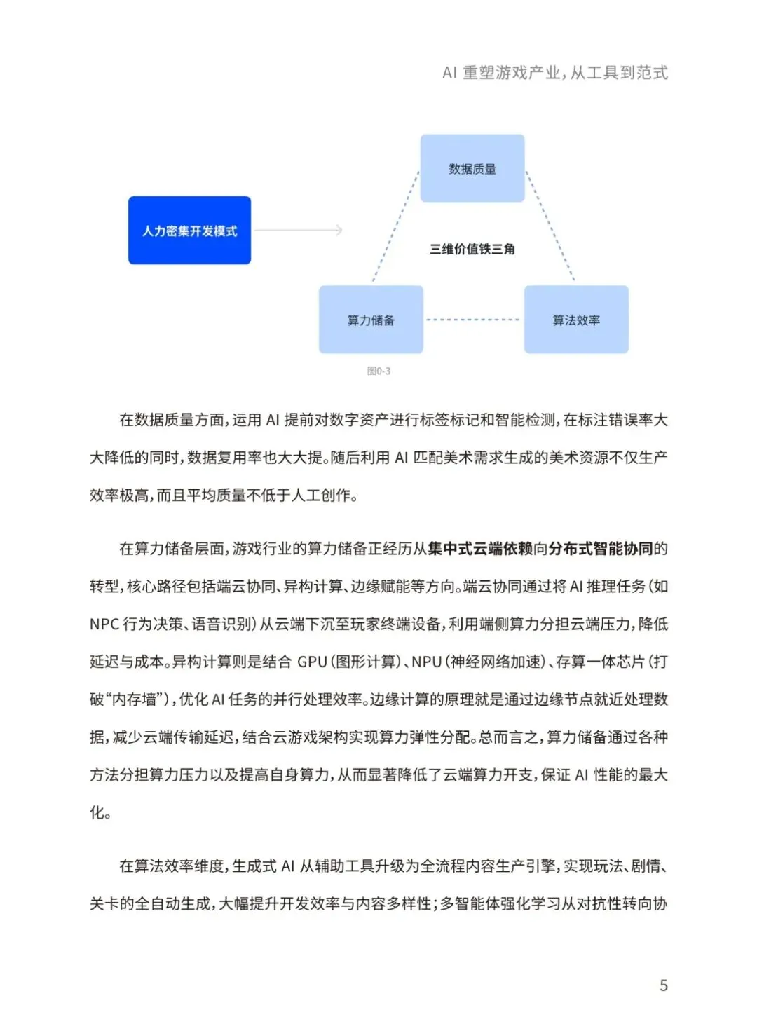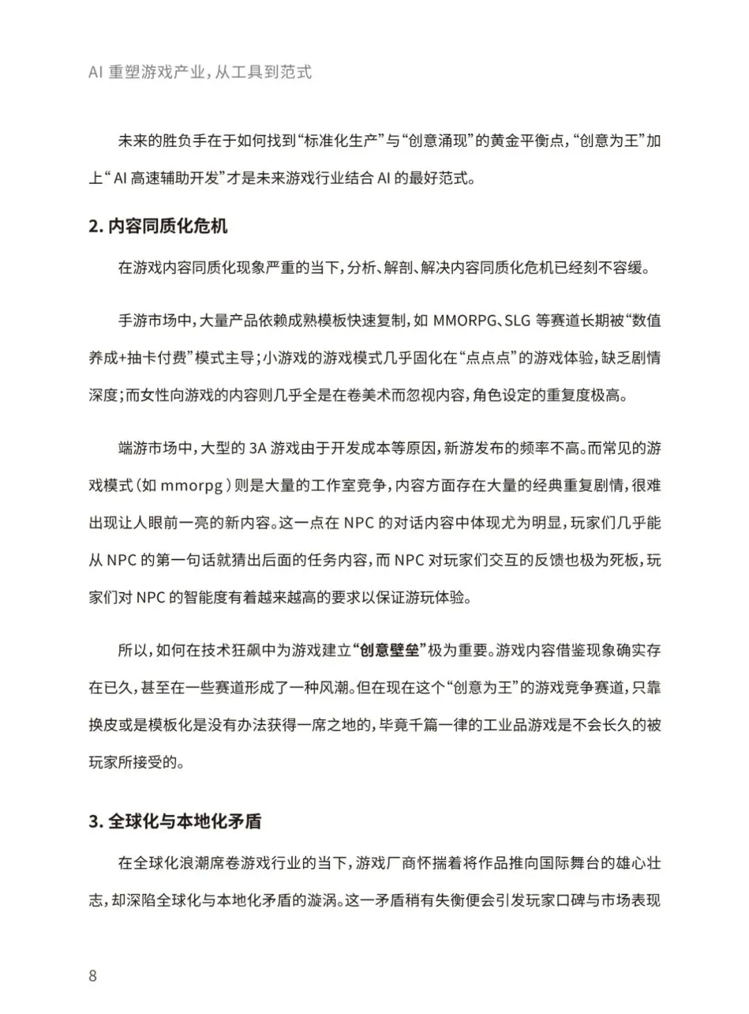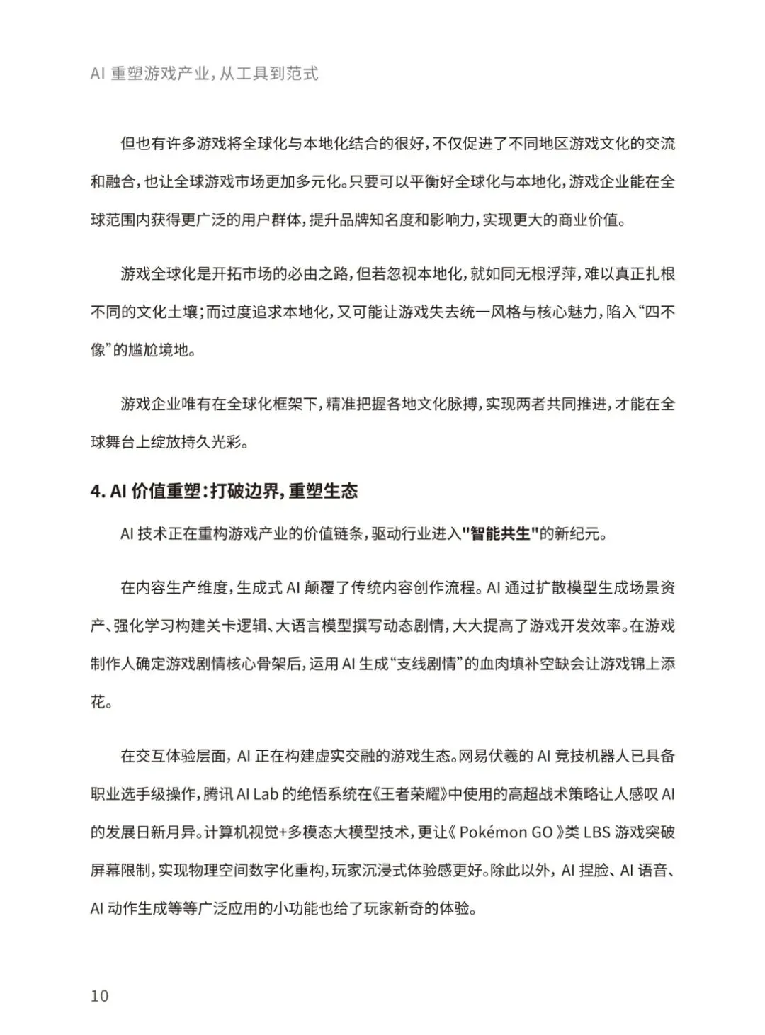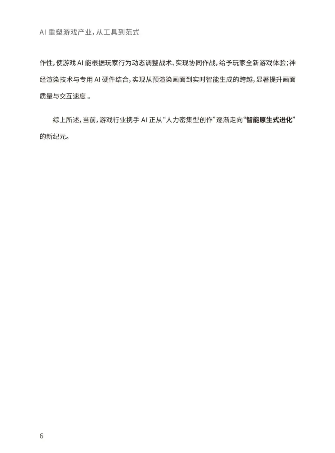 当前,生成式人工智能与大语言模型正以前所未有的力度和规模重构全球游戏产业格局。本报告将聚焦人工智能技术在游戏具体业务场景的实践落地,着重探讨人工智能技术为游戏行业带来的变革性影响及其未来发展趋向。通过整合最新行业动态、前沿技术进展,本报告致力于全面揭示人工智能赋能游戏创新、优化生产效能、丰富交互体验的内在逻辑,并展望其在构建下一代沉浸式、智能化游戏生态中的重要作用与发展前景。报告将围绕AI技术在游戏开发、运营、体验全流程的应用、AI技术未来在游戏领域的 演变方向、AI技术促进游戏行业命运共同体发展等核心命题展开,结合游戏大数据技术,为游戏行业从业者提供一份全面、深入的行业技术指南。