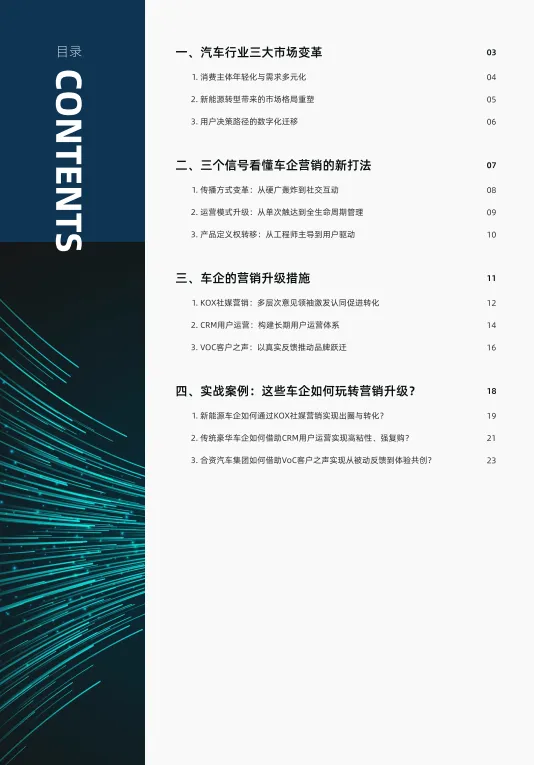 《2025汽车行业体验增长营销白皮书》聚焦行业变革,指出消费年轻化、新能源转型、决策数字化三大趋势重塑市场。报告提出营销新打法:从硬广轰炸转向社交互动,从单次触达到全生命周期管理,从工程师主导到用户驱动,社交化、精细化、用户化成为破局关键。白皮书详解落地路径:KOX社媒矩阵打通 “认知-信任-转化” 链路,CRM运营激活用户全生命周期价值,VOC客户之声实现体验共创。实战案例显示,新能源车企借KOX实现销量增长20%,豪华品牌靠CRM提升用户粘性,数据驱动+全链路协同是营销致胜核心。