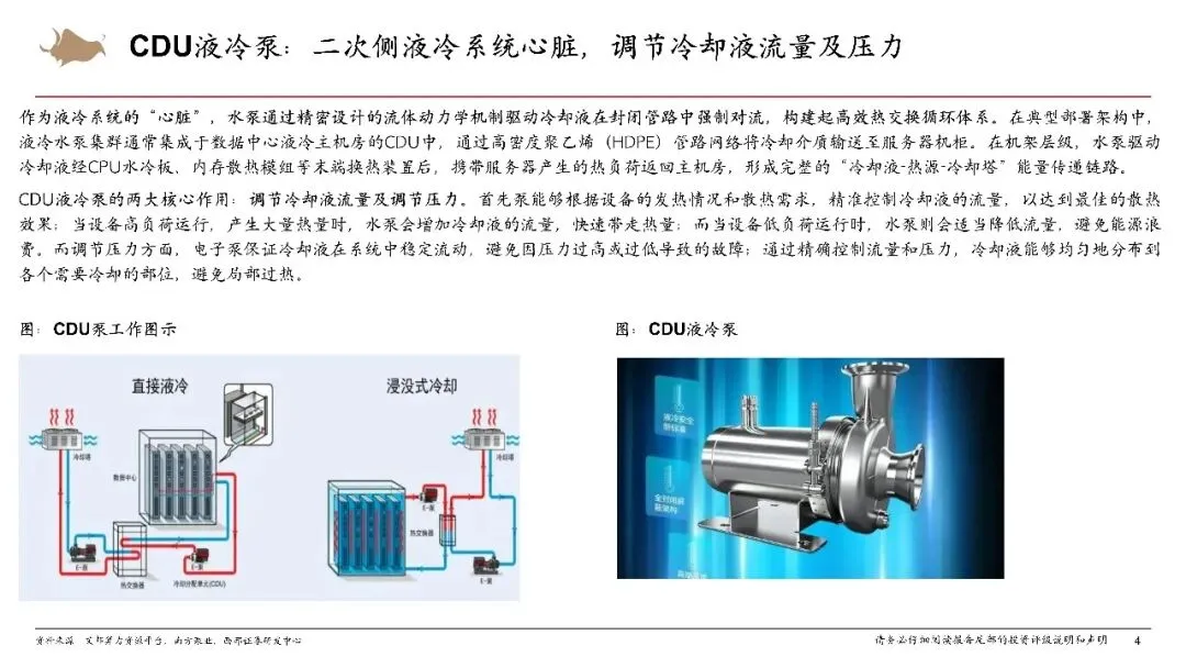 CDU液冷泵具有调节冷却液流量及调节压力的核心作用,作为液冷系统的“心脏”,水泵通过精密设计的流体动力学机制驱动冷却液在封闭管路中强制对流,构建起高效热交换循环体系。CDU作为液冷系统的控制中枢,价值量占系统30%-40%,而液冷泵作为CDU核心部件,价值量占CDU 35%。