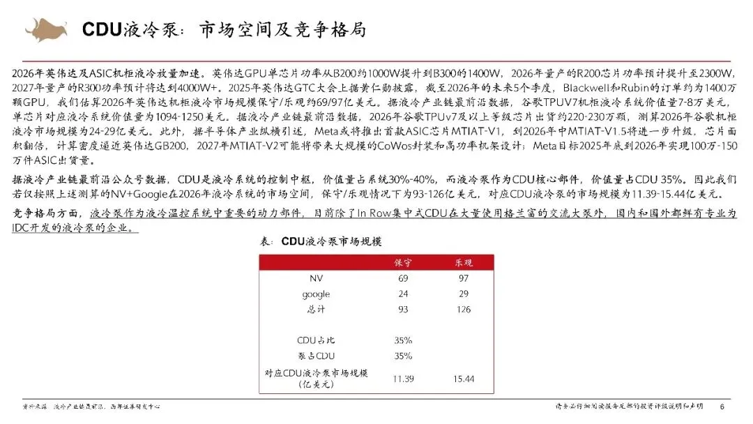 因此我们按照测算的NV+Google在2026年液冷系统的市场规模在保守/乐观情况下为93-126亿美元,对应CDU液冷泵的市场规模为11.39-15.44亿美元。液冷泵作为液冷温控系统中重要的动力部件,目前除了In Row集中式CDU在大量使用格兰富的交流大泵外,国内和国外都鲜有专业为IDC开发的液冷泵的企业。