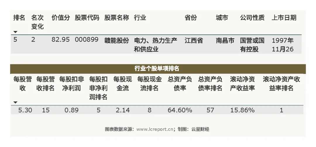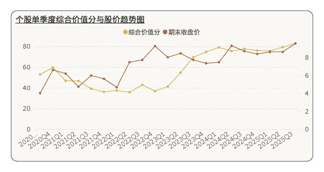 接下来我们来看下赣能股份的综合价值(注2)。在2025Q3季度,赣能股份的综合价值分为82.95分,行业排名第5,与上个季度相比增加2个名次。综合价值排名的提升,主要得益于公司盈利质量的改善、现金流的强劲增长以及资产运营效率的优化,反映出市场对公司综合竞争力的认可持续提升。