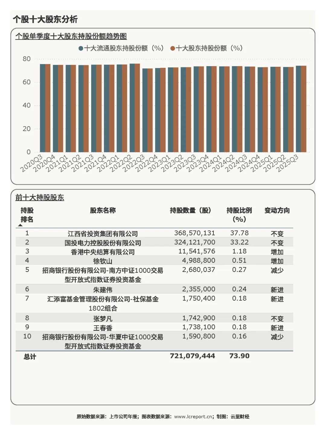 报告期末,赣能股份的十大股东持股比例为73.90%,股权集中度较高。前两大股东江西省投资集团有限公司与国投电力控股股份有限公司持股比例合计达71.00%,持股比例保持不变,彰显国有资本对公司发展的长期信心。