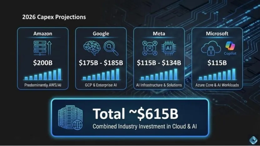 2026 年寒冬,元宇宙、微软、字母表和亚马逊四家超大规模云厂商发布的财报清晰显示,企业资本开支正呈加速态势。四家公司今年的资本开支总额将超 6150 亿美元,较本已处于高位的 2025 年同比增长约 70%。
