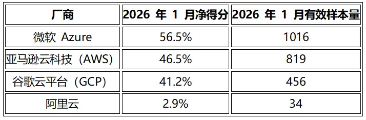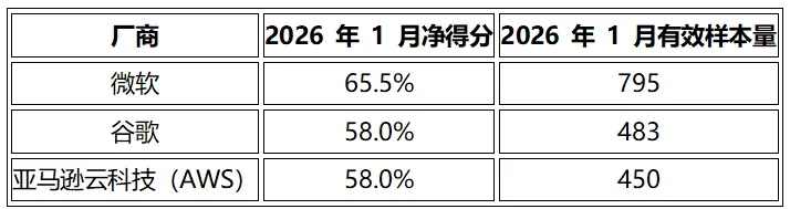 首先值得注意的是,云行业三巨头的净得分均超 40%,处于极高水平。微软 Azure 位于图表右上区域,数据表现亮眼 —— 净得分约 57%,有效样本量达 1016 家,完美诠释了 “全覆盖且仍在加速增长” 的行业地位。