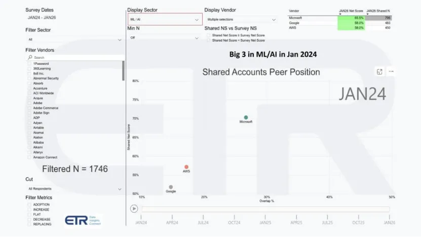 我们认为,人工智能和机器学习是谷歌云平台增长的核心驱动力,后续图表也印证了这一点。企业技术研究的调研数据显示,在机器学习 / 人工智能领域,谷歌的客户重叠度从 2024 年 1 月落后亚马逊云科技,反转为 2026 年 1 月实现反超;二者的投入增长动力相近,均处于 50% 以上的高位,而微软则以 65% 左右的净得分领先。
