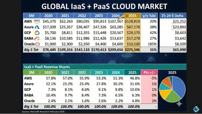 以下图表为我们更新的全球基础设施即服务(IaaS)+ 平台即服务(PaaS)云市场营收份额数据,上周我们曾发布初版,本次结合 2025 全年数据做更新。阿里云和甲骨文的财报尚未发布,相关数据将在其财报后进一步修正;微软采用财年核算,且未单独披露 Azure 营收,因此其数据为我们基于多方数据测算的日历年结果。