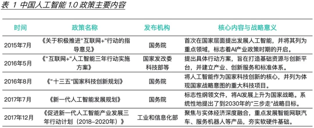 如图2和表1所示,1.0时代的政策发布集中在2015-2017年,在此期间中国先后颁布了《互联网+人工智能三年计划实施方案》以及《新一代人工智能发展规划的通知》等政策,将人工智能提升到国家级战略高度,聚焦与实体经济的深度融合,重点发展智能网联汽车、服务机器人等产品。同时期美国先后成立“AI和机器学习委员会”以及“AI高级研究计划局”,并在2016年颁布了《国家人工智能战略规划》,将AI也提升到国家战略层面。