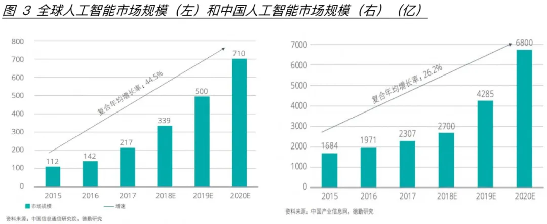 结合AI的技术发展时间线(图1)可以判断中美同时将AI提升到国家战略层面的主要原因是人工智能技术取得重大突破,深度学习和卷积神经网络等领域的重大进展(见图1)使得AI发展方向确定性增加且市场化价值初步显现,从德勤2018年的报告当中可以看到AI行业规模年复合增长率预测达到26%,在中国这一数据更是达到44%(图3); 中美政府都需要这样的技术创新推动社会生产力的发展。