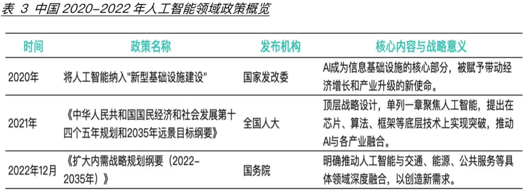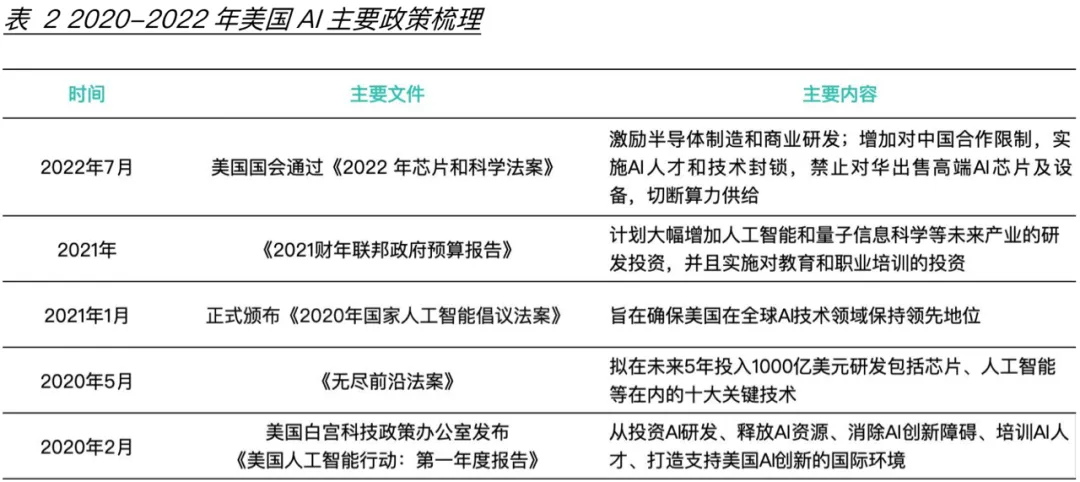 在这样的社会背景下,2020-2022年美国先后发布多项政策,包括对内的全面支持AI发展到对外的技术封锁和芯片压制(表2)。