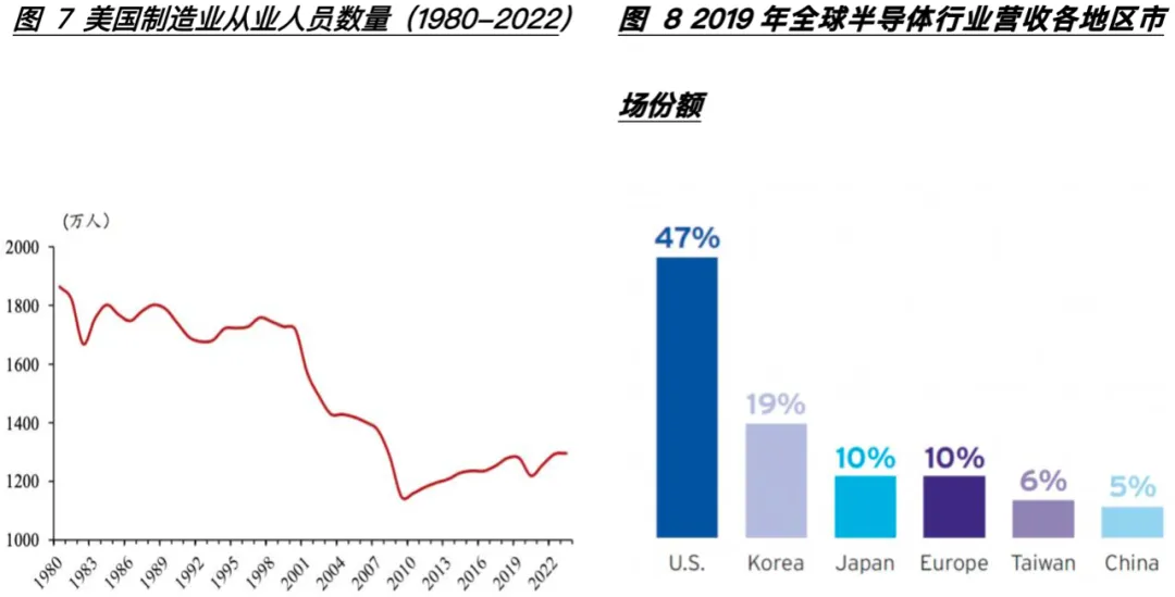从数据来看2010年后美国制造业从业人员锐减(图7),直到2020年其从业人员仍不足21世纪初的三分之二,且其高新科技产业的关键材料和产品高度依赖进口,《美国科学与工程指标2018》数据显示:随着企业持续投资研发设施并于学术界的合作增加中国工业有望向新兴和复杂的技术方向发展,在中端高科技产业,中国现在占主导地位,其全球份额在过去十年间几乎增长了两倍,达到32%。