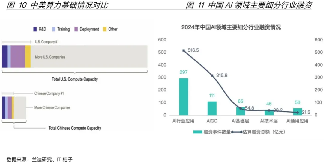 在2.0政策的引导下,中美在人工智能领域都迎来了各自的爆发期。虽然在芯片和数据中心等方面美国处于绝对领先的位置,但是在大模型性能和算法能力方面中美的差距在缩小。从2022-2024年人工智能专家/模型统计数据来看(图9),中国在人工智能领域论文的被引用量占比和专利授权数量方面都超过美国,标志性模型数量虽然不及美国但也远超其他国家和地区。兰迪公司2025年5月发布一篇文章回应“中国AI技术超车论”,文中也表示中国的模型性能在逼近美国,但美国在算力基础(图10)、制度生态与国际治理机制方面占据决定性优势;其作者表示中美的AI竞争不是比“谁的模型更聪明”,而是关于“谁能更可持续的运营AI生态系统”的制度博弈(海外智库观察,2025)。与此同时生成式人工智能技术(AIGC)的飞速发展带来了新的问题,这也从另一个角度印证了这个说法。
