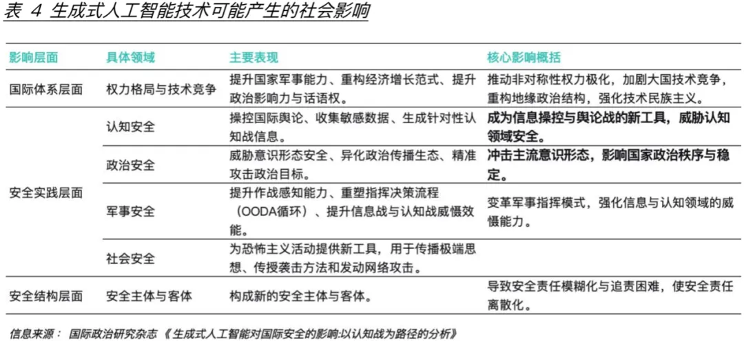 生成式人工智能技术(AIGC)利用生成式对抗网络 “创造”新的信息内容,包括图像、文本和音频等形式,比如典型的美国Open AI的ChatGPT以及中国的DeepSeek。外交学院国际关系研究所讲师贾子方和北京大学关系学院教授王栋在其《生成式人工智能对国际安全的影响:以认知战为路径的分析》一文中表示AIGC将进一步推动技术变革和产业进步,但同时也会对国际安全产生显著影响,包括政治、军事和社会安全等领域。它可以成为信息操控和舆论战的新工具,威胁认知领域安全,也会冲击主流意识形态,影响国家政治秩序和稳定(表4)。