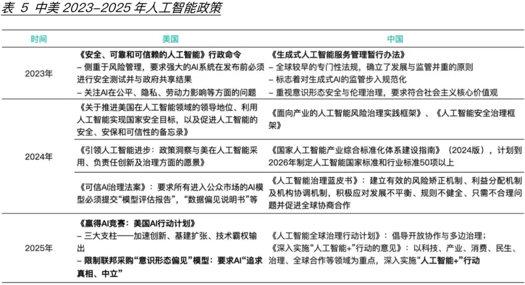 2023年以来,中美在全面发展人工智能产业的同时,对信息安全、社会伦理、制度监管及模型政治偏见等领域的政策引导逐渐增多。对内中美两国积极开展AI治理保障社会信息安全,美国先后颁布《安全、可靠 和可信赖的人工智能》行政命令、《AI行动计划》等,既要求大力发展人工智能三大支柱产业也要求加强人工智能的治理,尤其在2025年联邦政府强调限制采购具有“意识形态偏见”模型(表5);中国则在2023年就要求生成式人工智能需要重视意识形态和伦理治理,要求其符合社会主义核心价值观并随后发布多项AI治理政策。对外中美两国在积极推行“AI外交”跑马圈地,截至2025年4月,美国借助OECD、G7等推动“可信AI”框架的全球签署并成功让42个国家采纳其框架,成为国际技术贸易的“信任通行证”;中国则在联合国平台提出:全球AI发展倡议“并于金砖国家启动“AI伦理合作沙箱”等实施其国际影响力。美国这些政策在强调两件事情,即大模型“本土化”意识形态的必要性以及人工智能的社会伦理和法律约束。