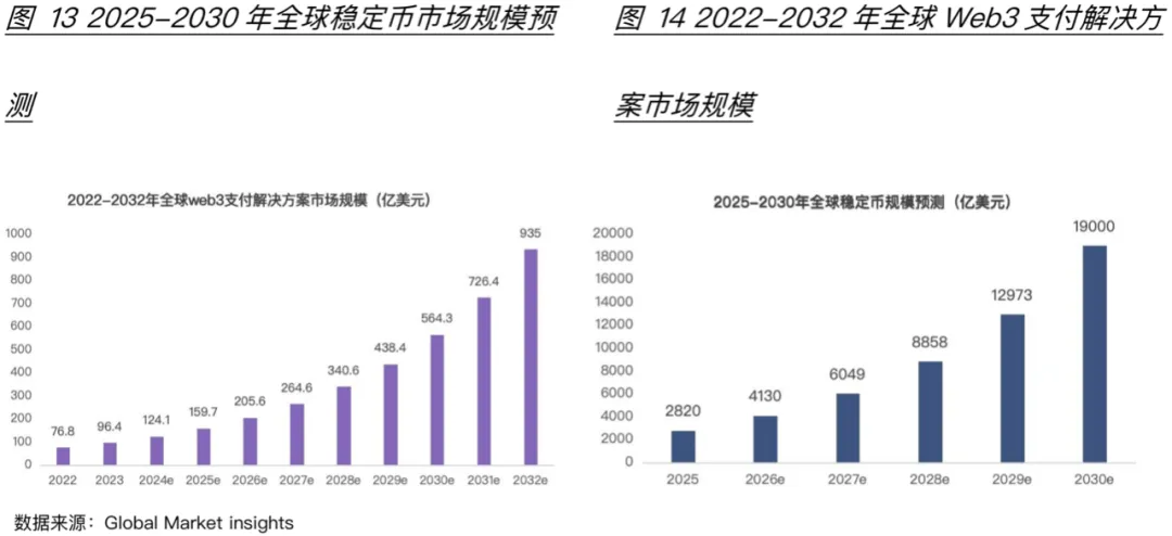 稳定币应用场景广,市场空间大。2025年全球稳定币规模在2820亿美元,渣打银行预测2030年稳定币规模将达到1.9万亿美元。而与稳定币应用密切相关web3和RWA领域市场前景也非常客观:据Global market insights报告,2023年全球web3支付解决方案(包括代币化资产支付、加密货币支付、基于NFT支付等)市场规模有96.4亿美元,预计2032年达到935亿美元;波士顿咨询预测,2030年RWA市场规模将攀升至16万亿美元,稳定币30%-50%份额将会流入RWA资产(图13、图14)。