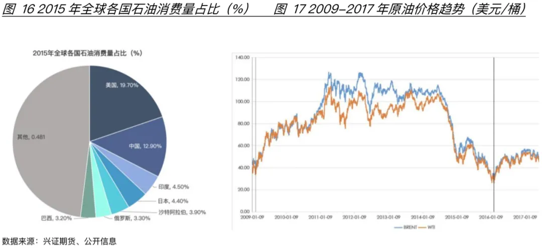 从能源结构的角度来看,对石油的过度依赖会影响民生稳定。原油供给市场集中度高,而中美是石油消费大国(图16),对原油供给和价格的波动十分敏感。因此,发展新能源以降低对石油资源的依赖和保证能源独立性也具有重要的战略意义。