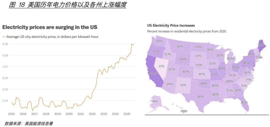2025年特朗普政府颁布《大而美法案》,取消对清洁能源以及对新能源汽车的税免政策,并且放开对传统能源的开采限制。这些政策背后是美国自2020年以来面临的能源价格上升和供给短缺的挑战,随着人工智能的发展和数据中心的建设热潮以及疫情后的电力需求反弹、燃料价格波动以及关税、通货膨胀等一系列因素,美国自2020年以来电力价格上升超30%(图18)。如果不能及时降低能源成本和解决能源紧张的问题,美国民众和企业不仅面临昂贵的能源成本,也会让美国在人工智能领域的竞争陷入被动甚至落后的局面。因此,现阶段其政府对待新能源态度秉承“去气候化”和“美国利益至上”的原则变得有迹可循,这既是解决当下燃眉之急的有效方案,也是保发展的无奈之举。
