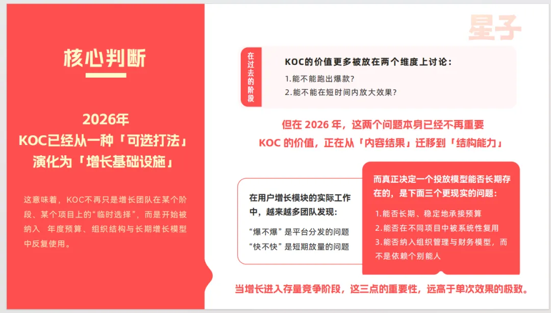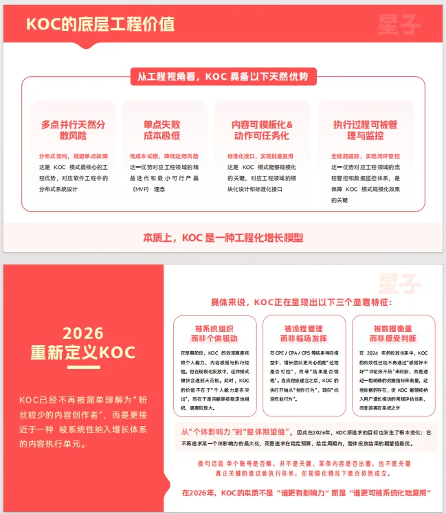 驱动这一转变的背景是用户增长团队普遍面临获客边际成本上升、流量碎片化、新产品冷启动容错空间压缩三重现实约束。与传统KOL模型存在的单点依赖度高、难以标准化复用、成本波动大、难以持续扩量等结构性问题相比,KOC模式具备多点并行分散风险、单点失败成本低、内容可模板化、执行过程可管理与监控的底层工程价值,成为一种工程化增长模型。