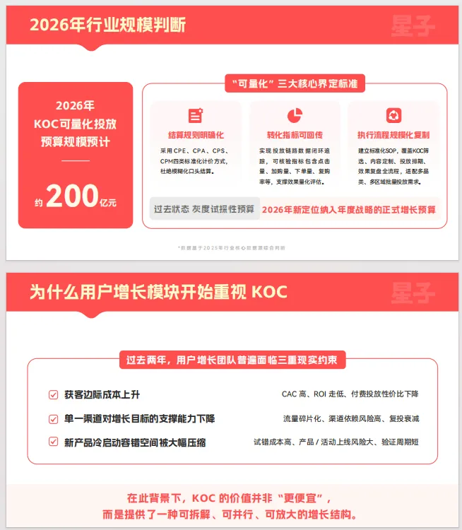 2026年KOC行业发展白皮书》核心观点是KOC(关键意见消费者)行业正从依赖流量红利转向依靠组织红利,KOC本身已从一种可选的市场打法演变为企业增长的基础设施。报告指出,2026年是KOC的“规模扩张与效率挤压期”,行业预算规模预计达约200亿元,并呈现出结算规则明确化、转化指标可回传、执行流程可规模化复制三大核心量化标准。