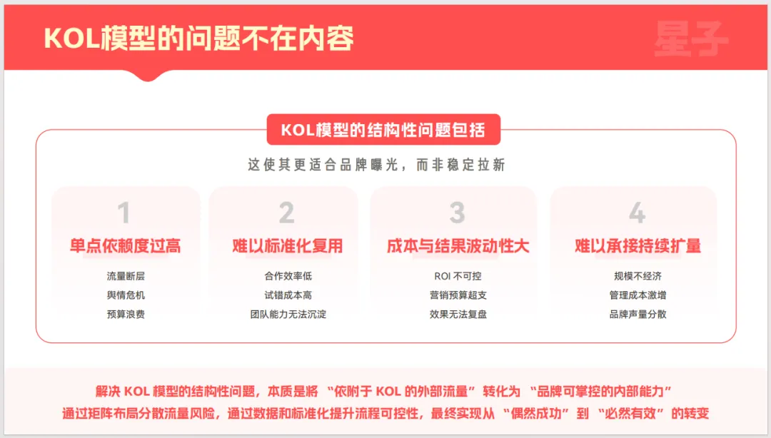 驱动这一转变的背景是用户增长团队普遍面临获客边际成本上升、流量碎片化、新产品冷启动容错空间压缩三重现实约束。与传统KOL模型存在的单点依赖度高、难以标准化复用、成本波动大、难以持续扩量等结构性问题相比,KOC模式具备多点并行分散风险、单点失败成本低、内容可模板化、执行过程可管理与监控的底层工程价值,成为一种工程化增长模型。