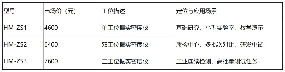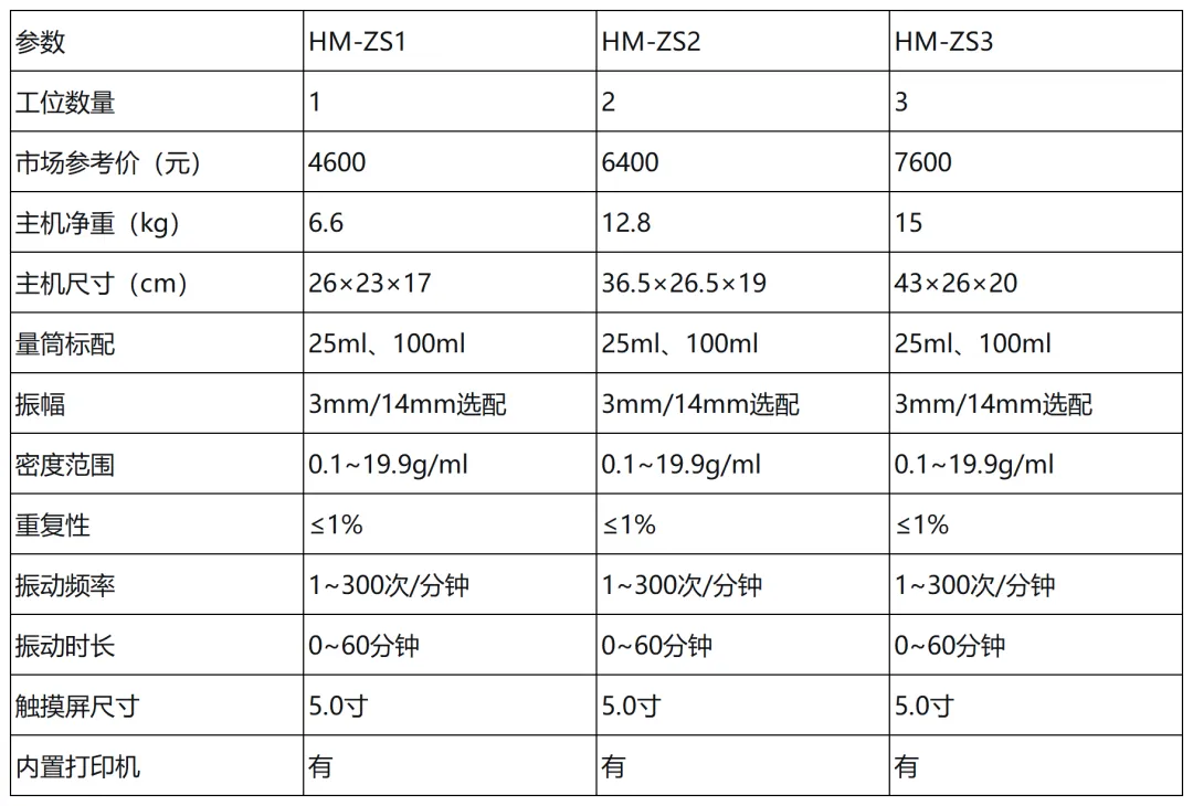 恒美智造目前推出三款振实密度仪,均采用5.0寸触摸屏、嵌入式微处理器及长寿命电机组件,满足不同检测通量与预算需求。