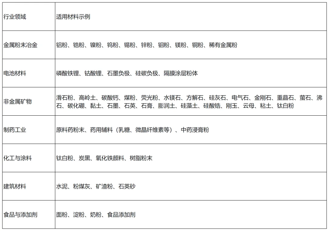 振实密度仪适用于几乎所有粉末状、颗粒状物料的堆积特性评价,具体行业及典型材料如下: