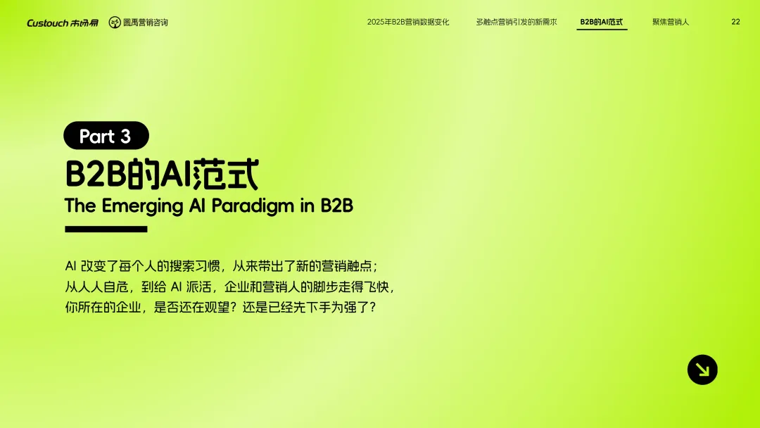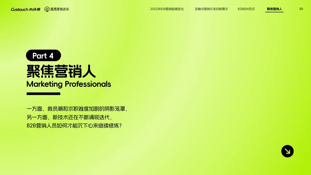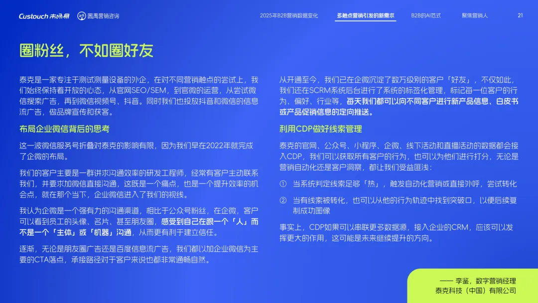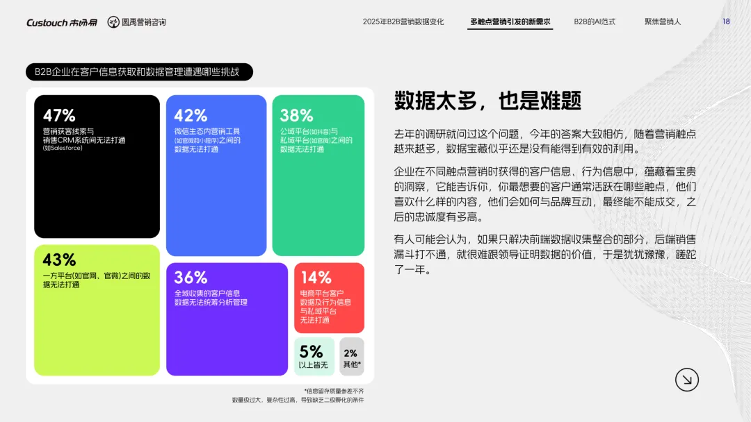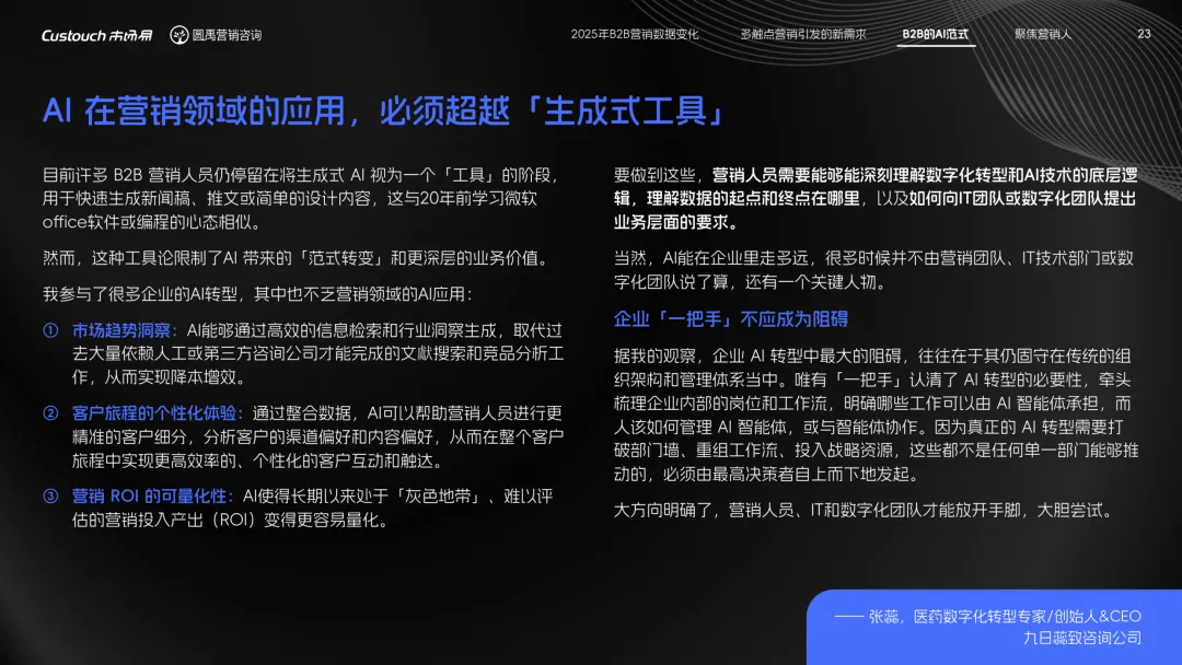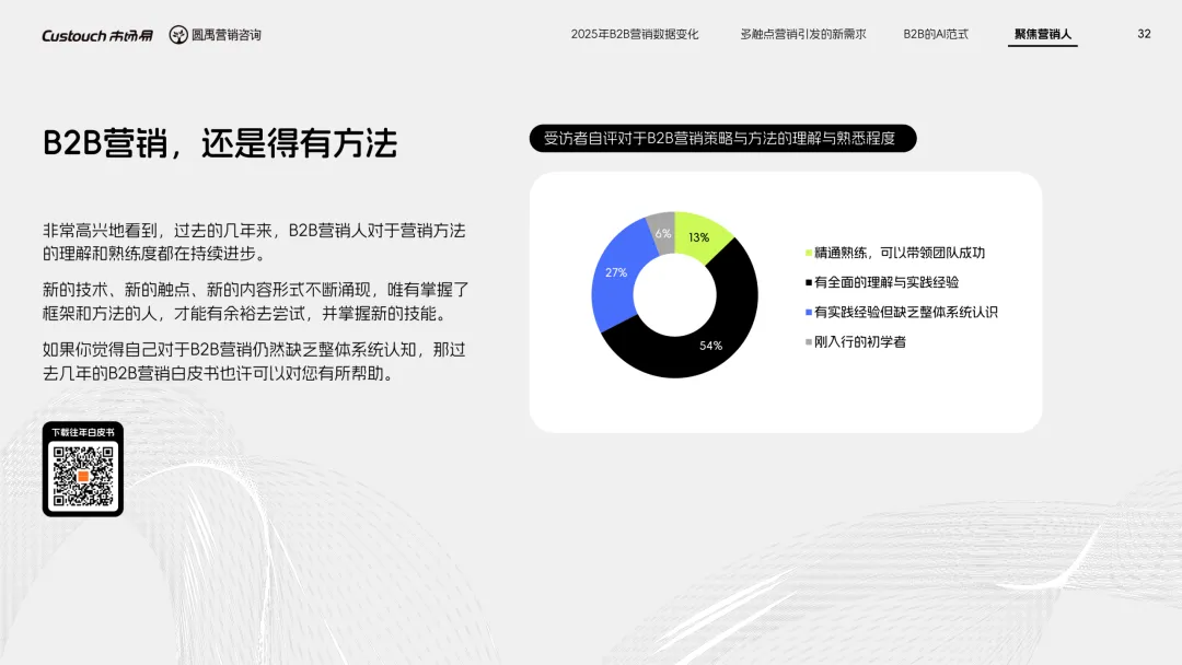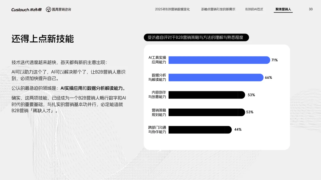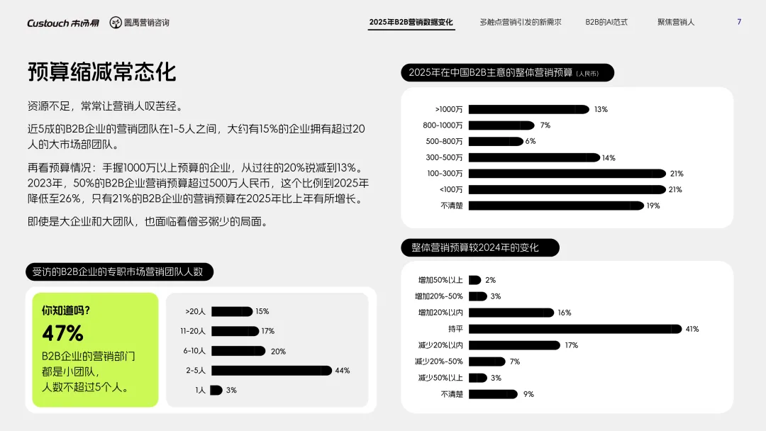 导读:报告聚焦 AI 技术爆发背景下的行业变革,通过调研与访谈呈现 B2B 营销人的生存现状与破局路径。2025 年市场环境趋紧,预算缩减成为常态,超半数企业营销团队不足 5 人,客户采购决策周期延长,营销部门需直面销量挂钩的绩效压力。多触点营销成为主流,企业平均采用 7.55 种渠道触达客户,但微信服务号折叠带来新挑战,跨平台数据打通与统筹管理成为核心诉求,CDP 工具凭借数据整合与安全合规优势获得广泛应用。AI 技术深度渗透营销全流程,7 成营销人运用 AI 生成文案、设计素材,33% 的企业已应用 AI Agent 优化线索筛选与客户服务。营销人面临技能升级压力,AI 实操与数据分析能力成为核心需求。兼具专业素养与技术应用能力的复合型人才稀缺,清晰的内容策略与系统化工具应用成为企业降本增效、应对市场变化的关键,为 B2B 营销行业提供了明确的发展方向。