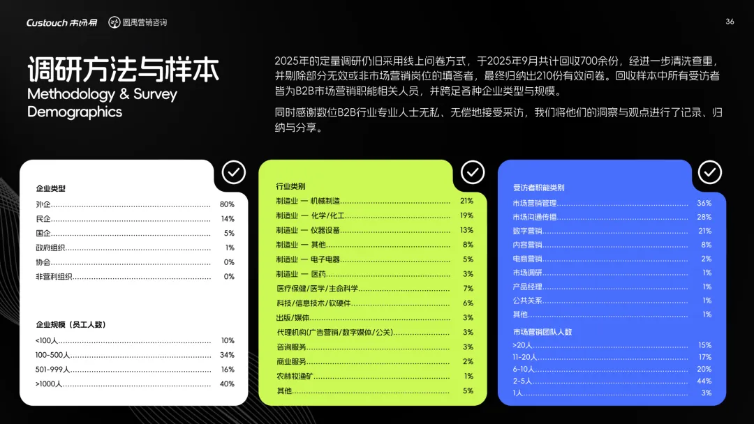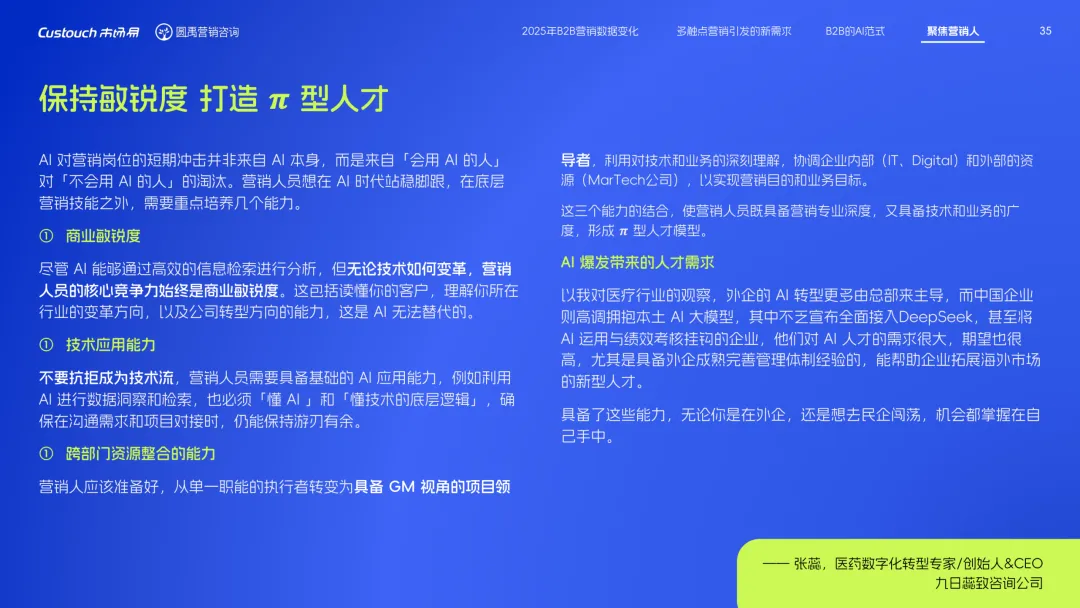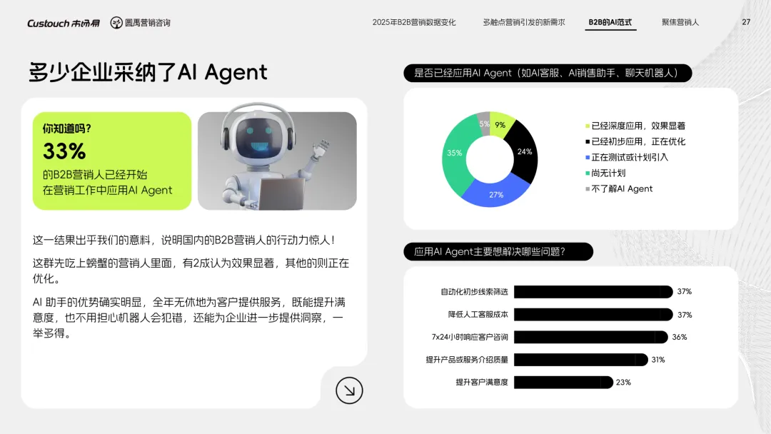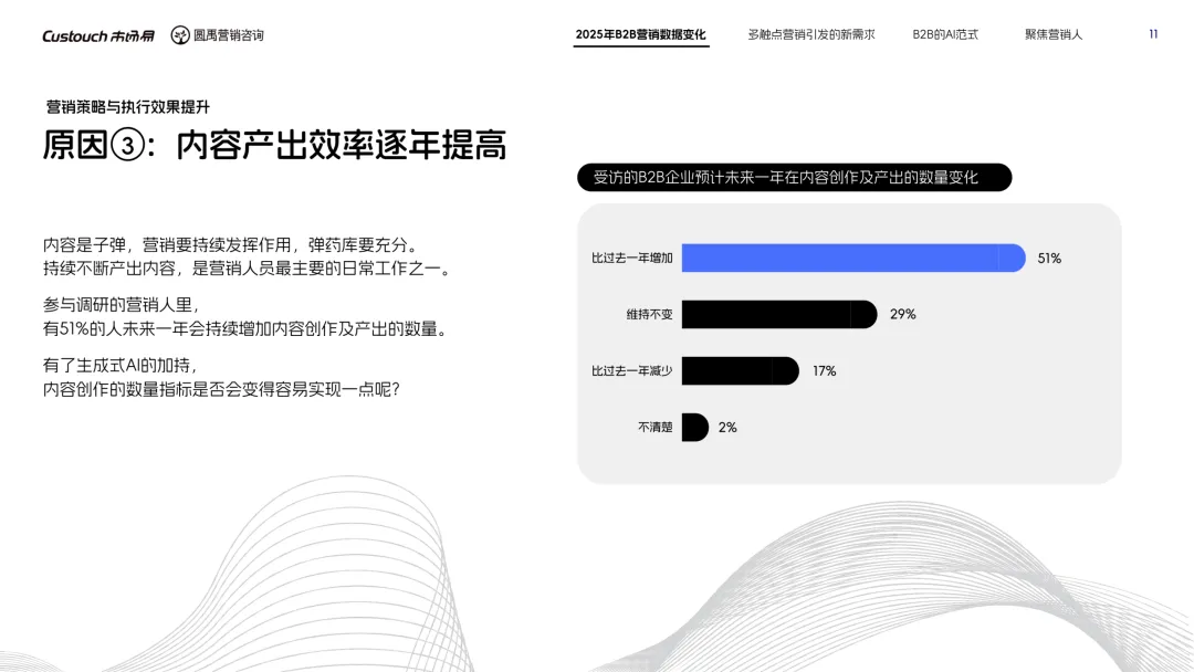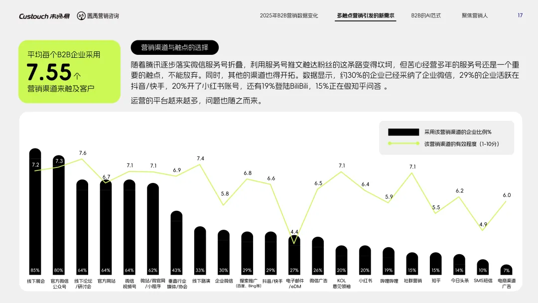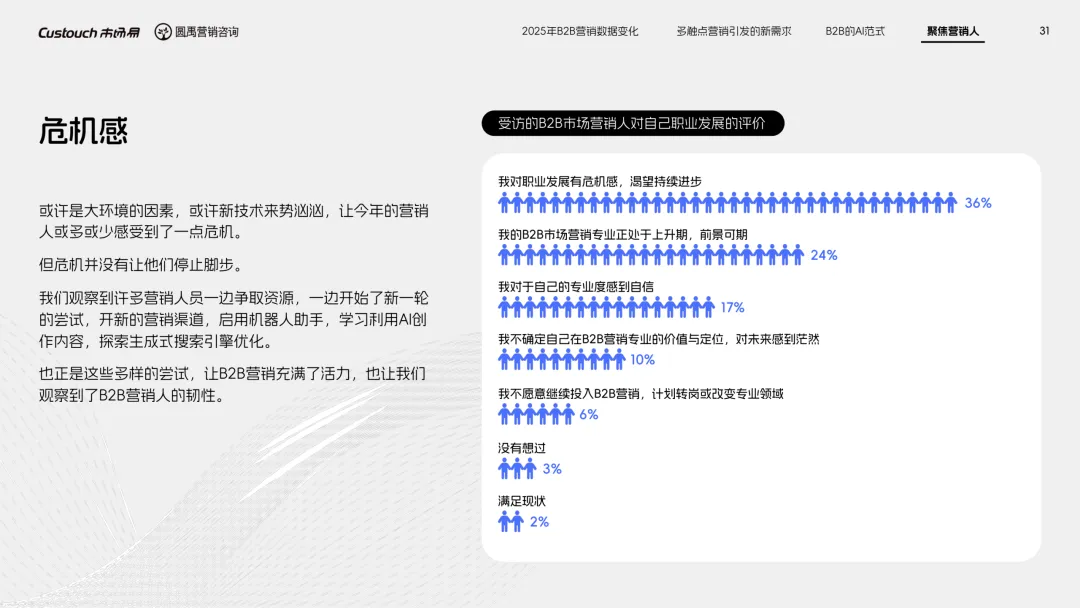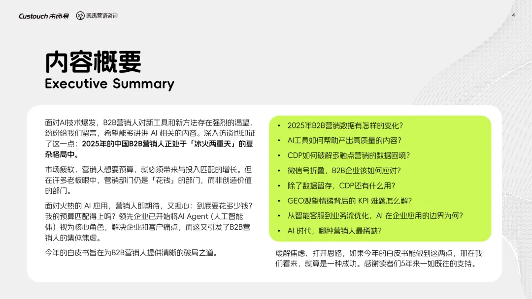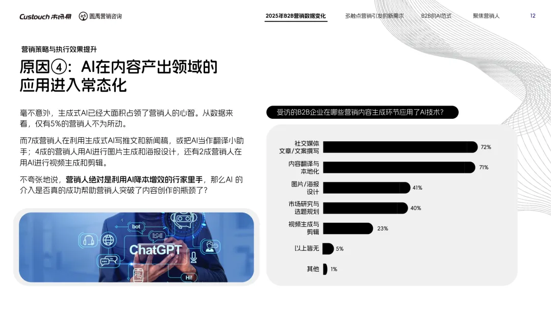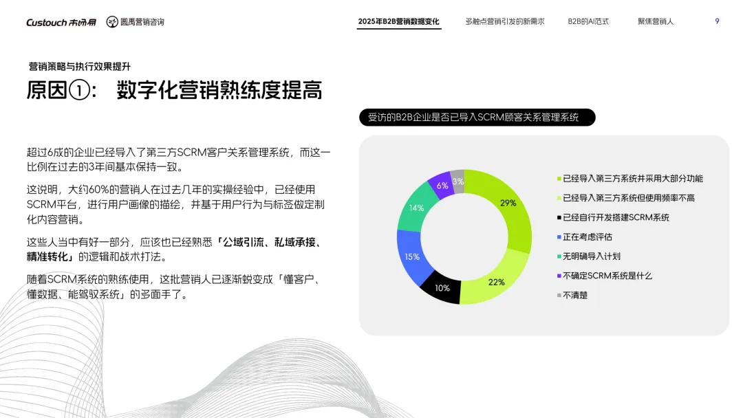 导读:报告聚焦 AI 技术爆发背景下的行业变革,通过调研与访谈呈现 B2B 营销人的生存现状与破局路径。2025 年市场环境趋紧,预算缩减成为常态,超半数企业营销团队不足 5 人,客户采购决策周期延长,营销部门需直面销量挂钩的绩效压力。多触点营销成为主流,企业平均采用 7.55 种渠道触达客户,但微信服务号折叠带来新挑战,跨平台数据打通与统筹管理成为核心诉求,CDP 工具凭借数据整合与安全合规优势获得广泛应用。AI 技术深度渗透营销全流程,7 成营销人运用 AI 生成文案、设计素材,33% 的企业已应用 AI Agent 优化线索筛选与客户服务。营销人面临技能升级压力,AI 实操与数据分析能力成为核心需求。兼具专业素养与技术应用能力的复合型人才稀缺,清晰的内容策略与系统化工具应用成为企业降本增效、应对市场变化的关键,为 B2B 营销行业提供了明确的发展方向。