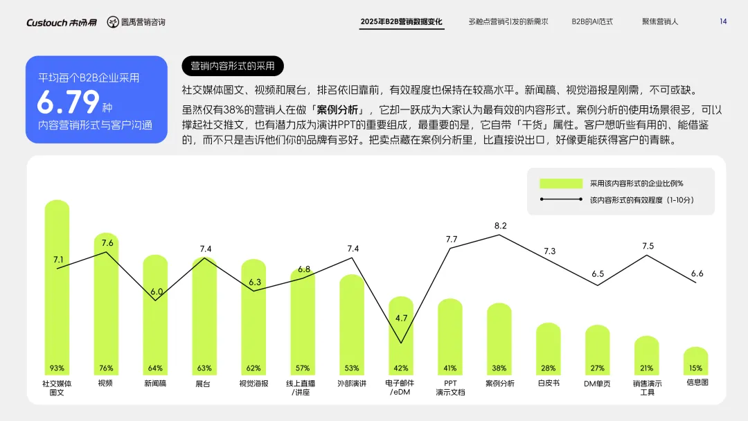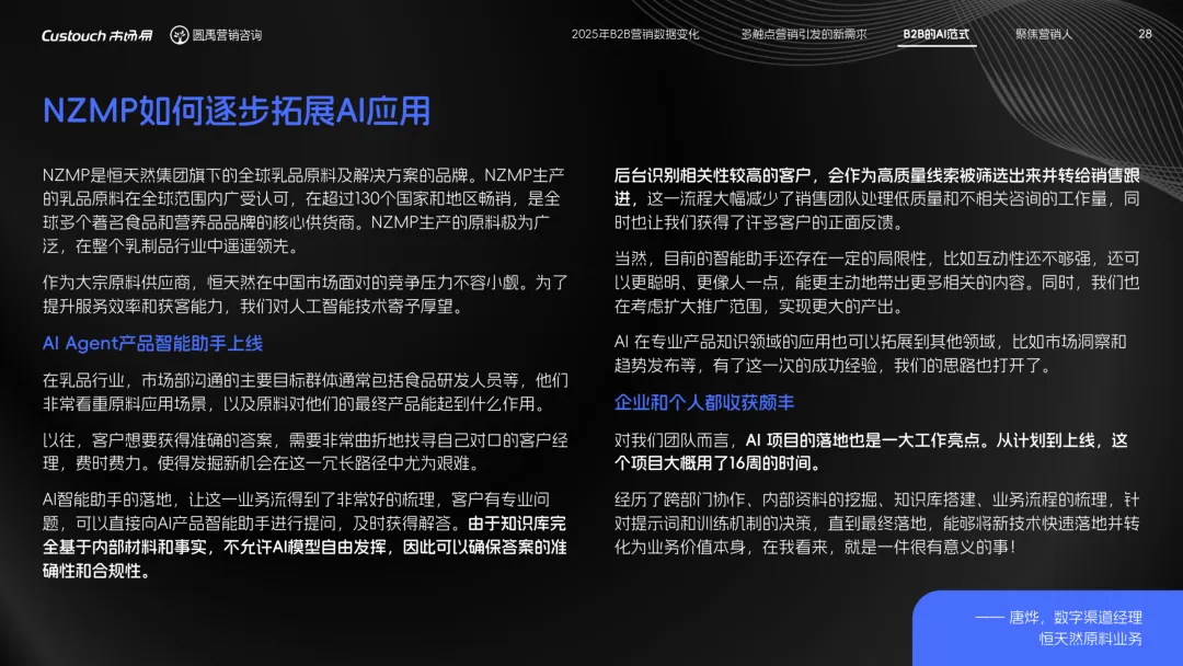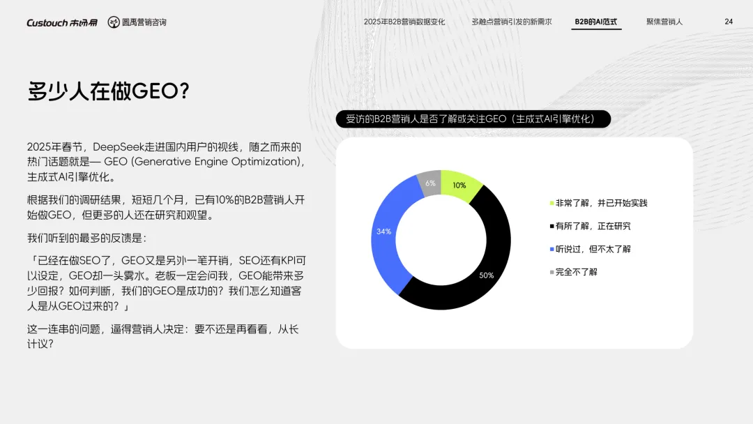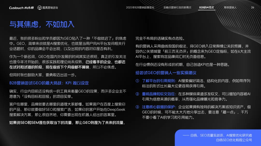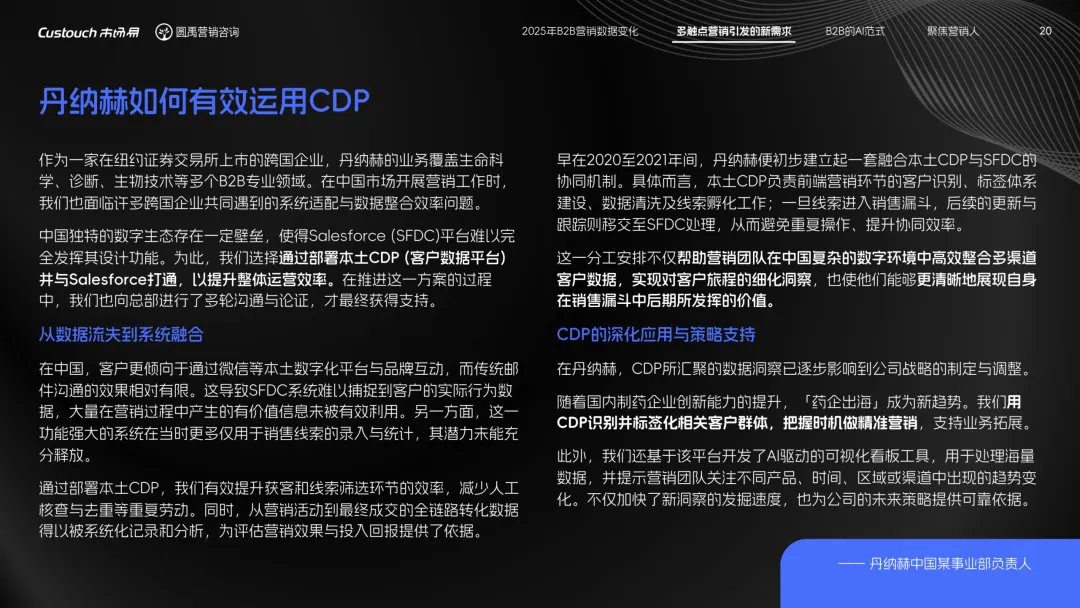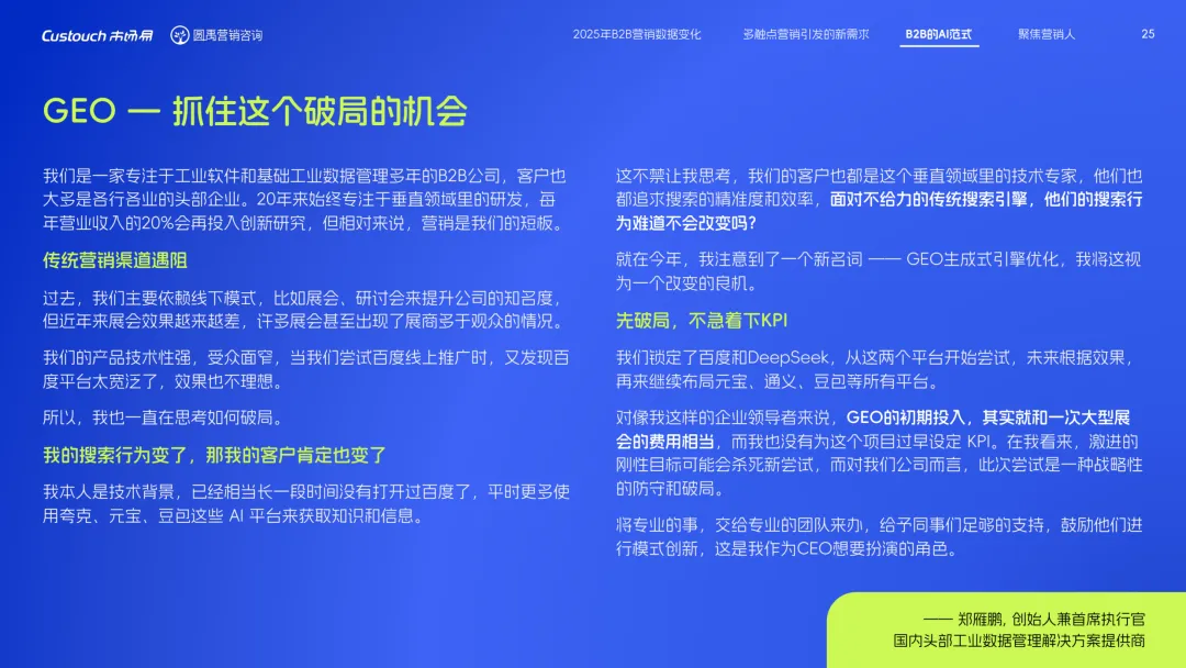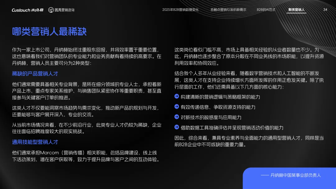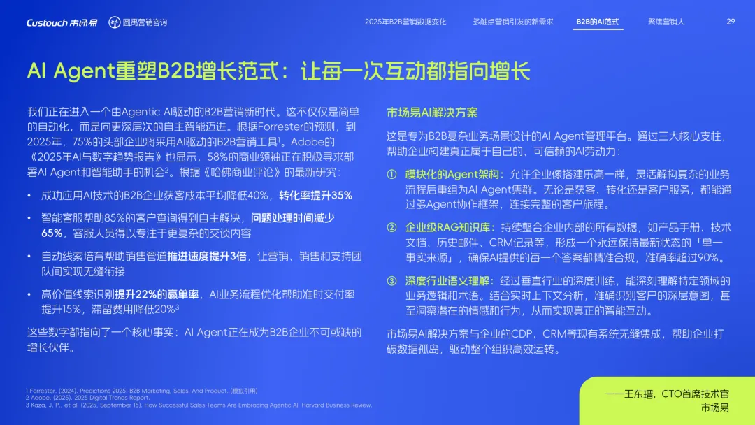 导读:报告聚焦 AI 技术爆发背景下的行业变革,通过调研与访谈呈现 B2B 营销人的生存现状与破局路径。2025 年市场环境趋紧,预算缩减成为常态,超半数企业营销团队不足 5 人,客户采购决策周期延长,营销部门需直面销量挂钩的绩效压力。多触点营销成为主流,企业平均采用 7.55 种渠道触达客户,但微信服务号折叠带来新挑战,跨平台数据打通与统筹管理成为核心诉求,CDP 工具凭借数据整合与安全合规优势获得广泛应用。AI 技术深度渗透营销全流程,7 成营销人运用 AI 生成文案、设计素材,33% 的企业已应用 AI Agent 优化线索筛选与客户服务。营销人面临技能升级压力,AI 实操与数据分析能力成为核心需求。兼具专业素养与技术应用能力的复合型人才稀缺,清晰的内容策略与系统化工具应用成为企业降本增效、应对市场变化的关键,为 B2B 营销行业提供了明确的发展方向。
