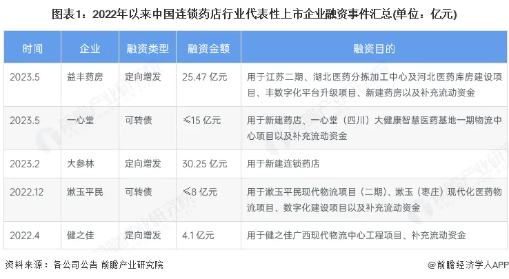 根据代表性上市企业融资公告,连锁药店行业的上市公司融资手段主要有定向增发、发行可转债。从整体来看,中国连锁药店行业上市企业的融资主要用于建设物流中心、新建药房和补充流动资金。2022年以来连锁药店行业代表性企业主要的融资事件如下: