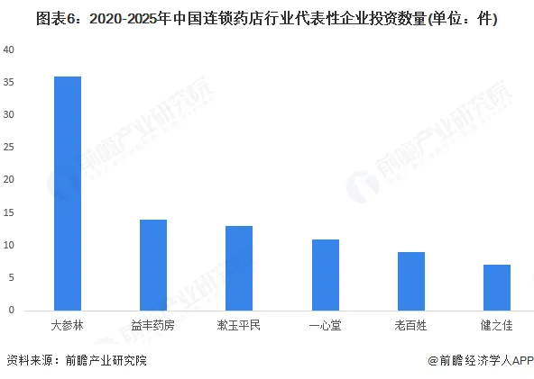 2020-2025年中国连锁药店行业代表性企业投资事件达到90件,其中大参林、益丰药房、老百姓三家企业投资事件数量最多,分别达到36件、14件和13件。