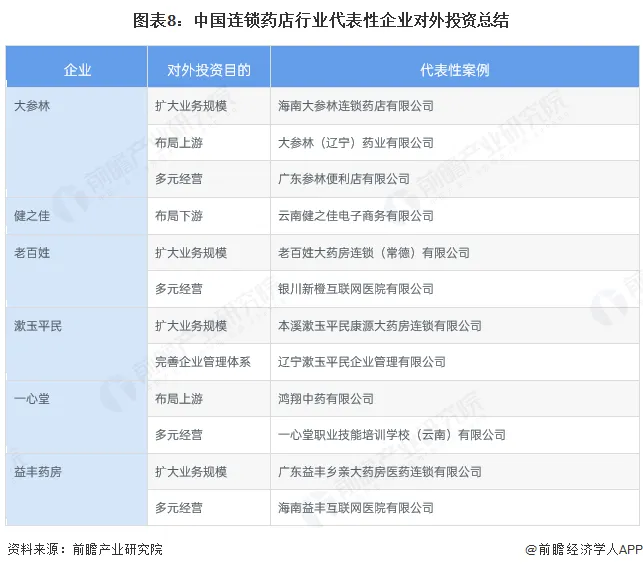 从几家代表性企业的对外投资目的来看,扩大业务规模、多元化经营较多,例如大参林、老百姓等在不同区域投资连锁药店子公司,增加企业在不同区域的布局,以扩大公司规模;大参林、老百姓、一心堂、益丰药房等发展多元业务,提升企业的抗风险能力。