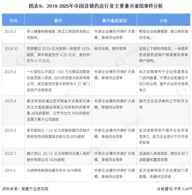 近年来,我国连锁药店行业发生的兼并重组事件多出于中游企业扩大规模的目的,主要为收购其他品牌的药店增加门店数量,提升企业在个别区域的业务布局。2019-2025年中国连锁药店行业主要并购事件汇总如下: