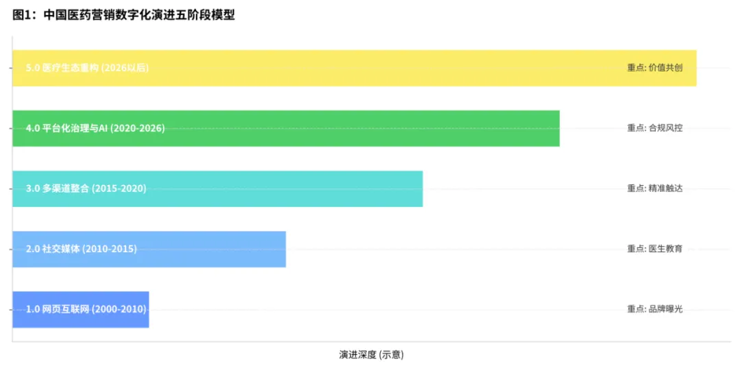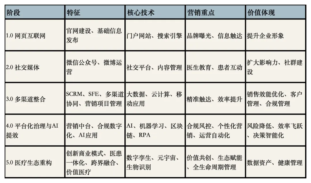中国医药营销数字化并非一蹴而就,而是遵循一个渐进式的演进路径。我们可以将其划分为以下五个阶段: