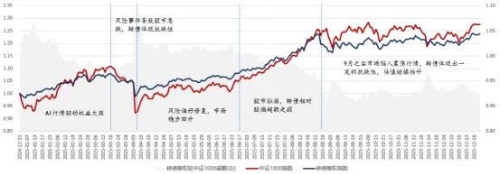 分阶段具体来看:年初市场延续震荡格局,2月在AI行情的催化下权益大涨,转债市场中位数逐步攀升至120元以上,低价券持续修复;3月中旬起,市场担忧海外算力下调引发调整,4月初中美贸易战黑天鹅事件爆发,恐慌情绪蔓延导致转债跟随权益市场出现全年最大回撤;贸易战风波后,市场风险偏好稳步回升,期间受益于红利风格走强以及公募等机构大幅增配转债,大盘底仓品种尤其是金融类转债迎来阶段性行情;7月起,随着海外算力需求得到验证,AI算力、半导体等行业景气度持续上行,叠加“反内卷”主题催化,市场呈现以科技为主线的单边上涨行情,转债价格攀升至历史峰值;9月之后市场陷入震荡行情,期间股市几次冲高,但处于估值高位的转债整体弹性相对偏弱,且经过大半年的牛市行情演绎,公募固收+产品大量交易盘涌入转债市场,市场运行一定程度上受到负债端因素影响,整体跟涨能力弱于前三季度,但随着溢价率持续抬升,整体依然体现出一定的抗跌性。