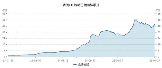 具体来看,截至2025年末,可转债市场总规模约为5500亿元,较上年末减少1800多亿元。一方面,发行高峰期的转债纷纷进入存续期最后一两年,其中包含早年发行的大额银行转债、交运转债等底仓品种;另一方面,权益市场牛市行情促使大量转债通过强赎方式退出市场,2025年全年到期兑付或转股退出的转债共计170余支,退出规模达2300多亿元,创近五年新高。需求端方面,“固收+”产品规模持续增长带动资金加速入场,并且由于管理人倾向于通过可转债ETF快速建仓,可转债ETF及指数化转债基金规模实现快速增长,转债市场工具化特征凸显,这也进一步强化了市场的同涨同跌效应。