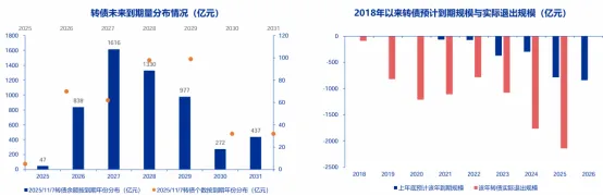 2025年转债资产弹性表现突出,除股性主导定价这一核心因素外,供需结构失衡亦是关键支撑逻辑。随着市场风险偏好提升及利率维持低位震荡,固收策略管理人面临严峻的“资产荒”困境,而可转债作为兼具股性与债性、具备“进可攻、退可守”特性的特殊资产,成为此类资金的重要配置标的。与此同时,大量转债到期兑付或强赎转股退出市场,导致转债市场存量规模持续缩减,供需矛盾共同支撑全年转债估值持续突破新高。