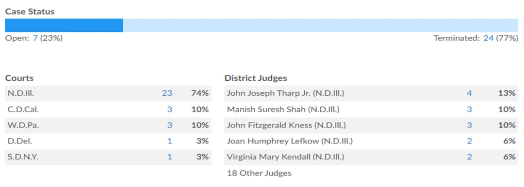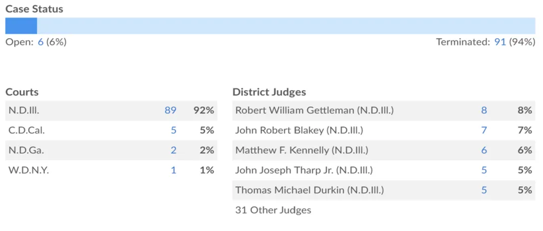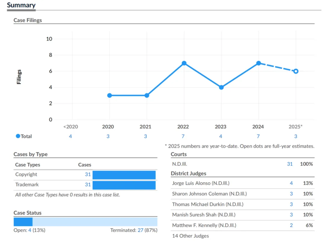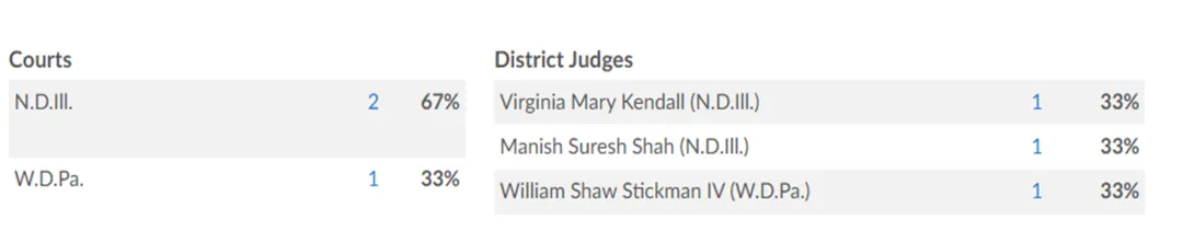 根据公开数据库,以N.D. Ill.为例,权利人频繁选择该法院提起诉讼,代表性权利人如Wham-O Holding, Ltd. 92%的知识产权案件、Elizabeth's Studio LLC 74%的知识产权案件、MERCIS B.V. 100%的知识产权案件、Y. Chan 67%的知识产权案件等均选择N.D. Ill.管辖。这一选择体现了权利人对诉讼效率与裁判可预期的理性追求,但亦使中国被告在程序启动阶段即面临严峻的结构性劣势,须在实体抗辩之外额外克服司法惯例与程序壁垒所带来的系统性负担。
