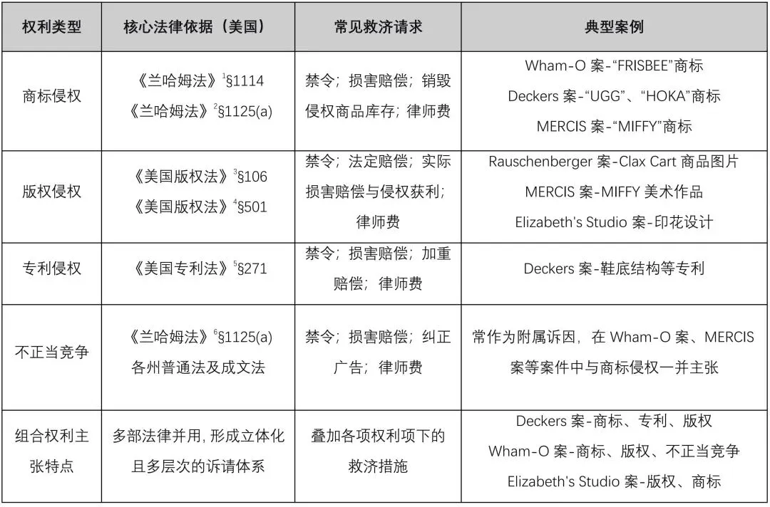跨境电商诉讼主要围绕商标权、版权及专利权三大知识产权类型展开,权利人多倾向于采取组合权利主张策略,以强化诉请、提高胜诉可能并扩大救济范围。各类权利在诉讼中的具体表现、法律依据及典型案例对比如下: