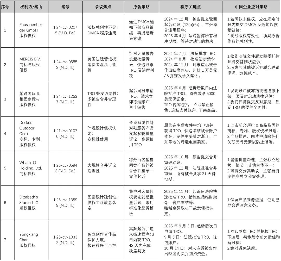 本报告系统梳理了2024-2025年度中国跨境电商企业在美国知识产权涉诉的7个典型案例,涵盖版权、商标、专利等多种权利类型,突出呈现权利人的维权策略、司法程序特点及对中国企业的合规启示。具体分析如下表: