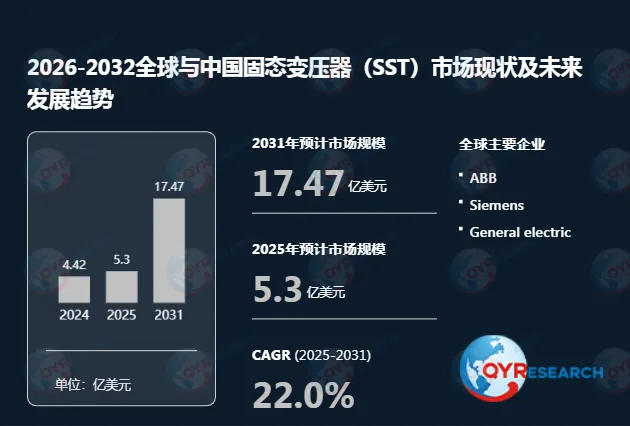 根据QYR(恒州博智)的统计及预测,2025年全球固态变压器(SST)市场销售额达到了5.3亿美元,预计2031年将达到17.47亿美元,年复合增长率(CAGR)为22.0%(2025-2031)。