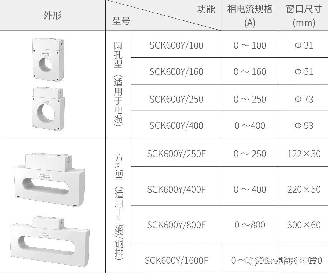 根据所穿线缆规格不同和回路额定电流不同,需选择不同规格型号的SCK600Y电气火灾剩余电流监控探测器,具体规格尺寸如下表: