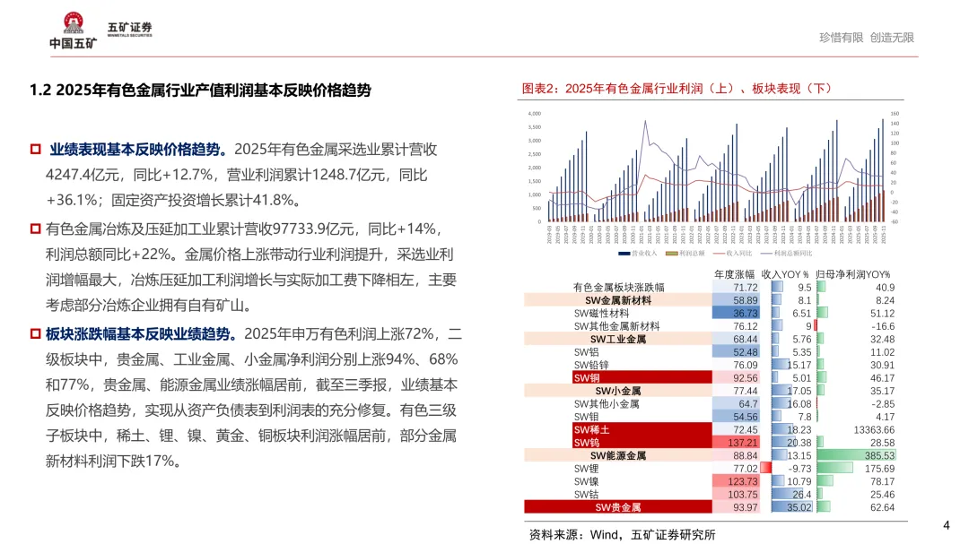 业绩表现基本反映价格趋势。2025年有色金属采选业累计营收4247.4亿元,同比+12.7%,营业利润累计1248.7亿元,同比+36.1%;固定资产投资增长累计41.8%。