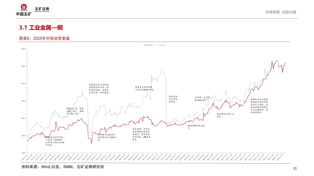 2025年受到关税和美联储降息预期的波动,以及地缘环境下战略金属政策等影响,有色金属价格除铅、中重稀土基本出现普涨。