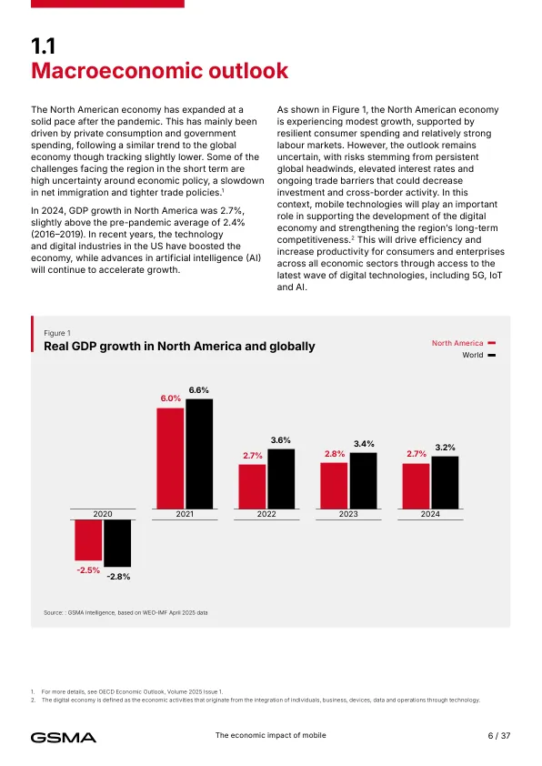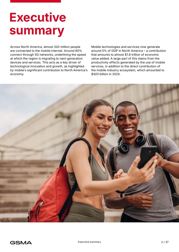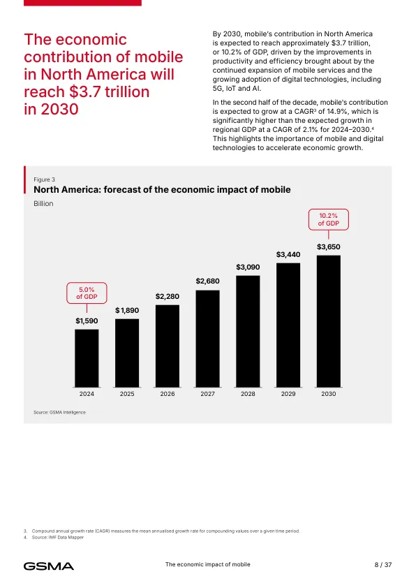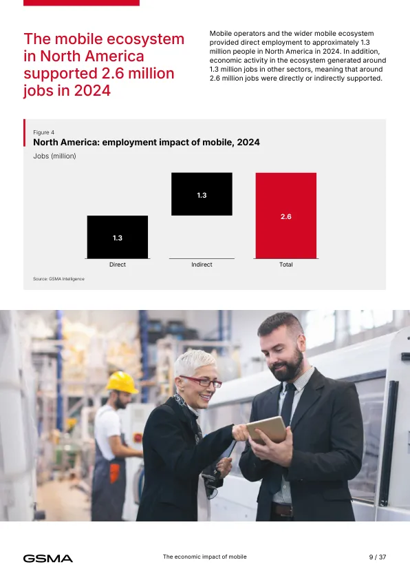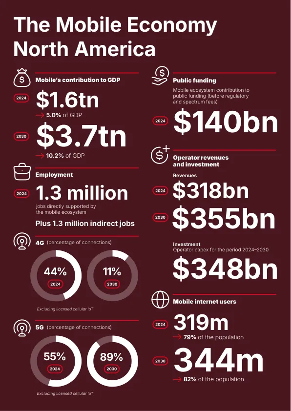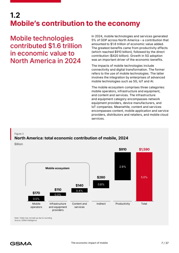 - 当前贡献(2024年) 移动产业直接+间接贡献1.6万亿美元,占北美GDP的5%,支撑260万个就业岗位,并为政府带来1400亿美元税收。