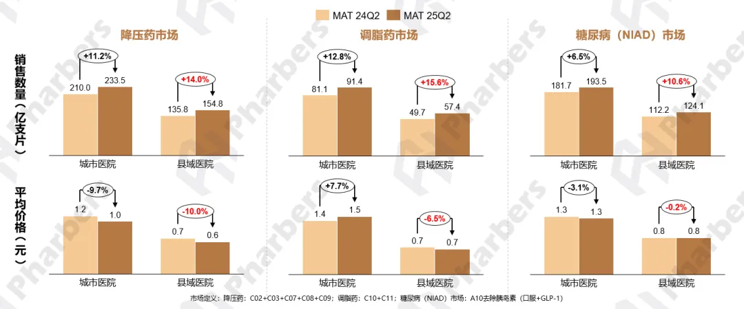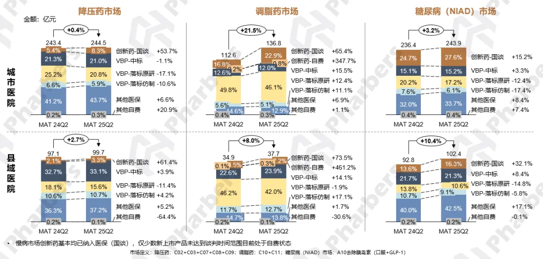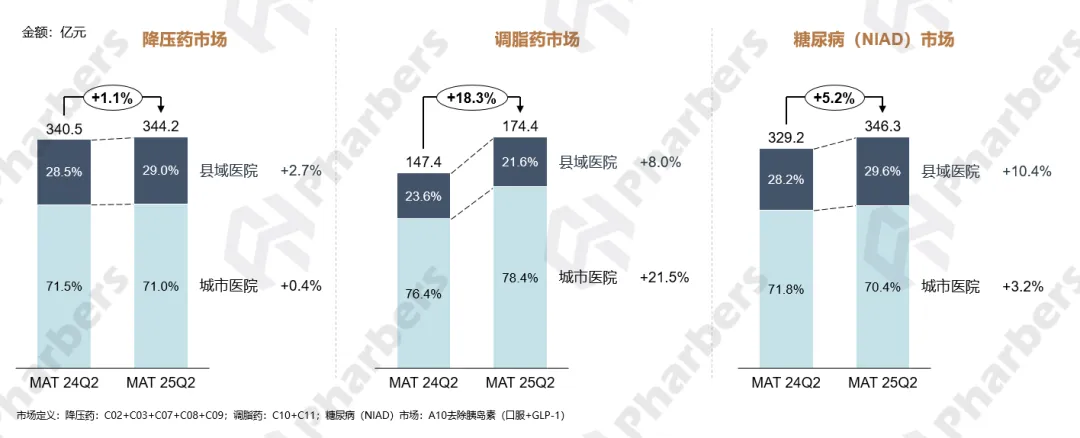 根据法伯院内渠道数据显示,虽然我国医院渠道MAT25Q2药品市场整体呈负增长,但是三个慢病市场规模均同比正增长,尤其是降压药和糖尿病市场,在县域医院渠道的规模增速高于城市医院(图1)。