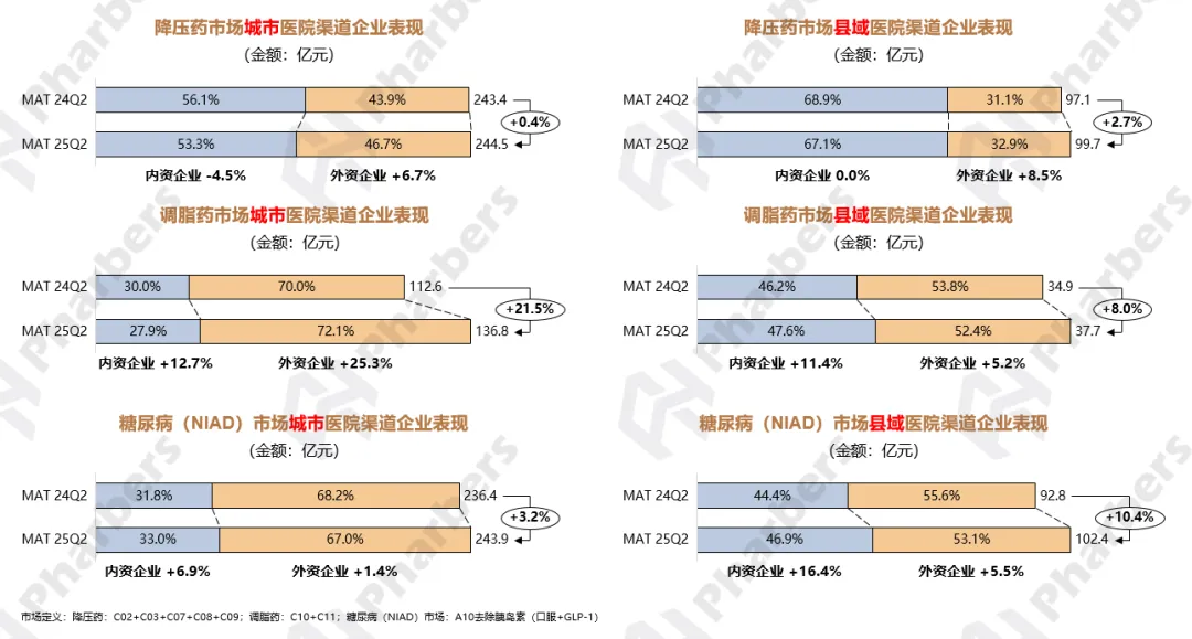 分别关注医院渠道相关慢病市场的内外资企业格局,根据法伯院内渠道数据显示,降压药市场方面,两类医院渠道均是内资企业销售额贡献较高,而MAT25Q2的增长却是由外资企业带动的,其中拜耳、诺华表现突出;调脂药市场方面,外资企业在城市医院渠道贡献超70%,MAT25Q2同比增长达到25.3%,而在县域医院渠道,内资企业占比将近50%,且整体增速高于外资;糖尿病市场方面,外资企业在城市医院渠道贡献近70%,无论城市还是县域医院,均是内资企业增速更高(图3)。