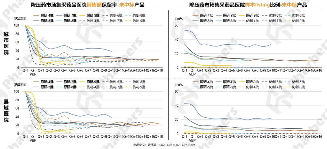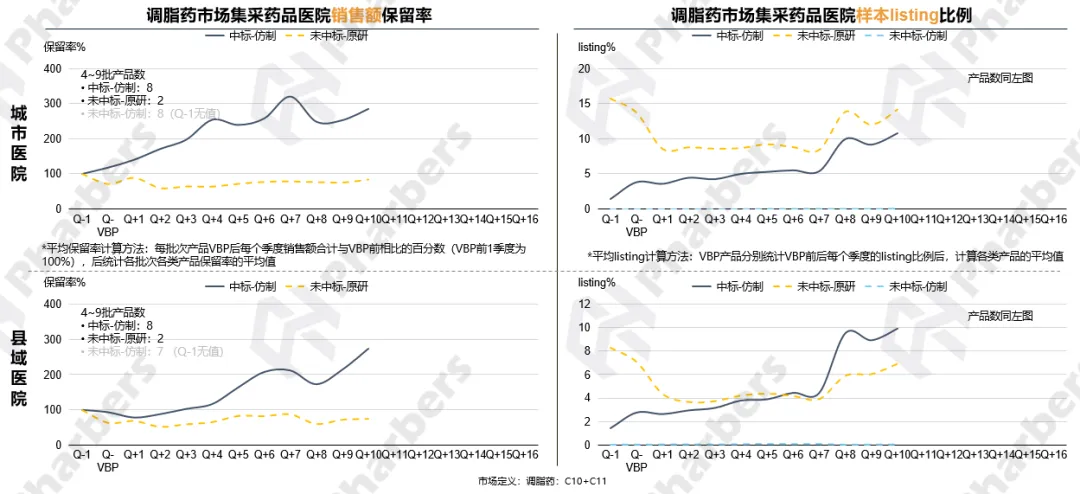 分批次来看,中标仿制产品大致符合高listing比例,销售金额高增长的趋势;未中标原研产品也同样符合高listing比例,高保留率的规律(图9)。