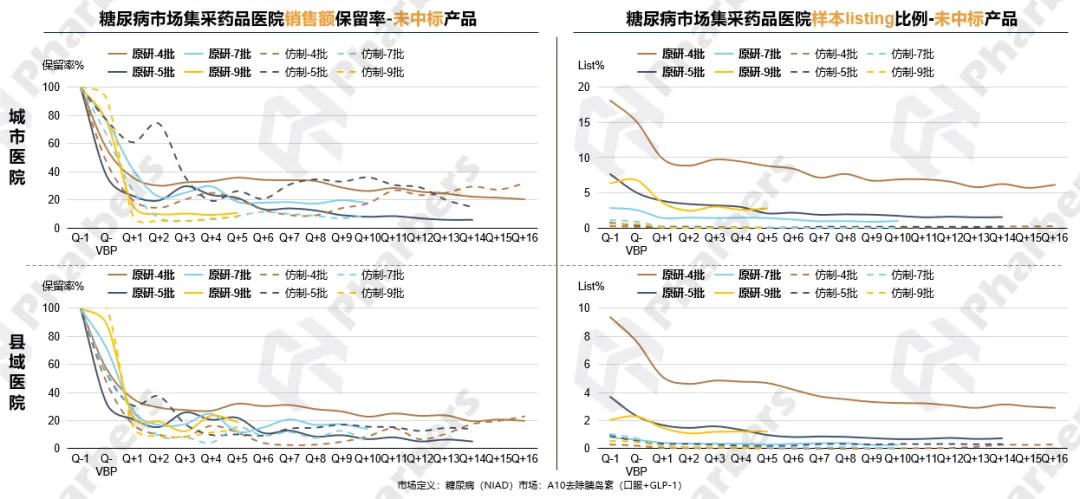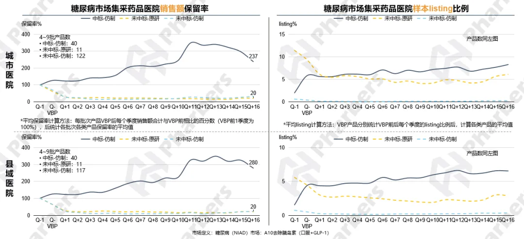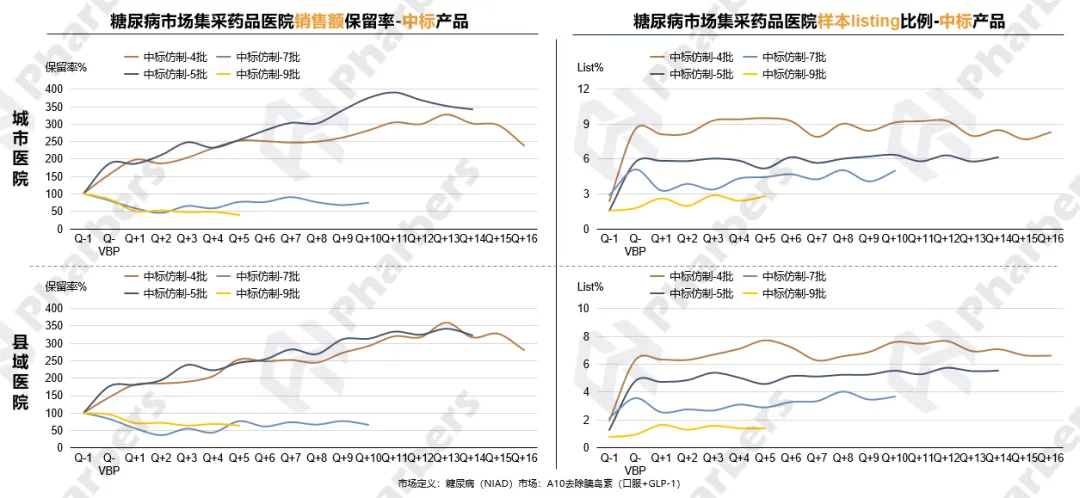 最后关注糖尿病VBP市场,法伯数据显示,中标仿制产品listing比例在城市和县域医院均高于未中标原研;但从保留率角度分析,与其他慢病市场相比,中标仿制产品并未出现明显(3倍)的高增长(图8)。