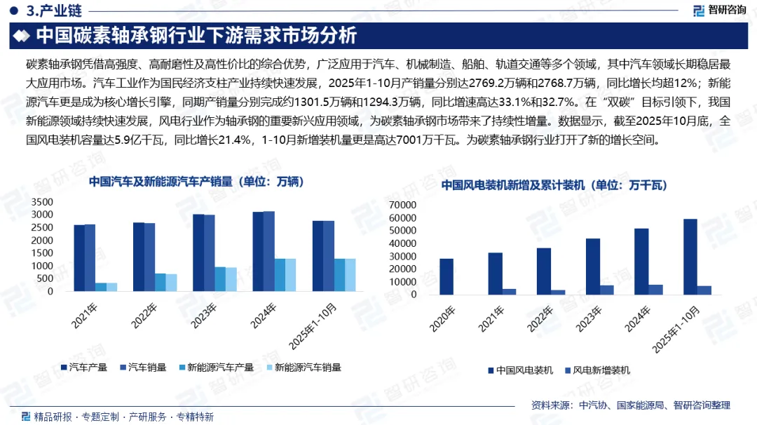 轴承钢作为高端装备制造的核心特种钢材,性能直接决定轴承的精度与寿命,广泛应用于汽车、风电等领域。其粗钢作为产业链基础原料,受原材料成本上涨、低端产能出清及行业结构优化影响,2025年1-10月产量405万吨,同比微降0.36%,呈现波动下滑态势;而轴承钢材产量逆势增长,同期达372万吨,同比上涨3.43%,这得益于企业对粗钢的精炼提纯与工艺升级,以及高附加值产能的释放。作为核心细分品类的碳素轴承钢,凭借高性价比适配中低速轻载荷工况,在新能源汽车、农机装备等领域需求扩容下市场需求稳步攀升,头部企业还通过提升钢材纯净度、优化热处理工艺,进一步拓展了其在精密微型轴承等细分场景的应用空间。