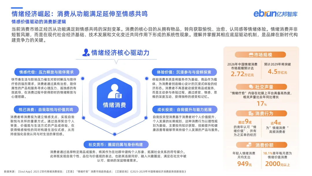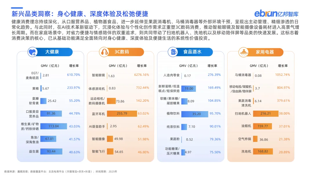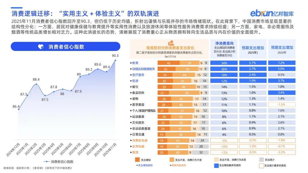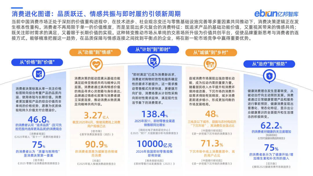 2025 年中国消费市场迈入存量精耕与结构性变革新阶段,社会消费品零售总额突破 50 万亿元,线上实物消费增速趋缓,流量增长转向价值深耕,消费逻辑呈现 “实用主义 + 体验主义” 双轨演进,健康保健、教育、旅游等品类需求旺盛,家电、烟酒等传统品类增长乏力,情绪消费、即时零售成为市场新增长点,AI 技术则深度重塑零售全链路。